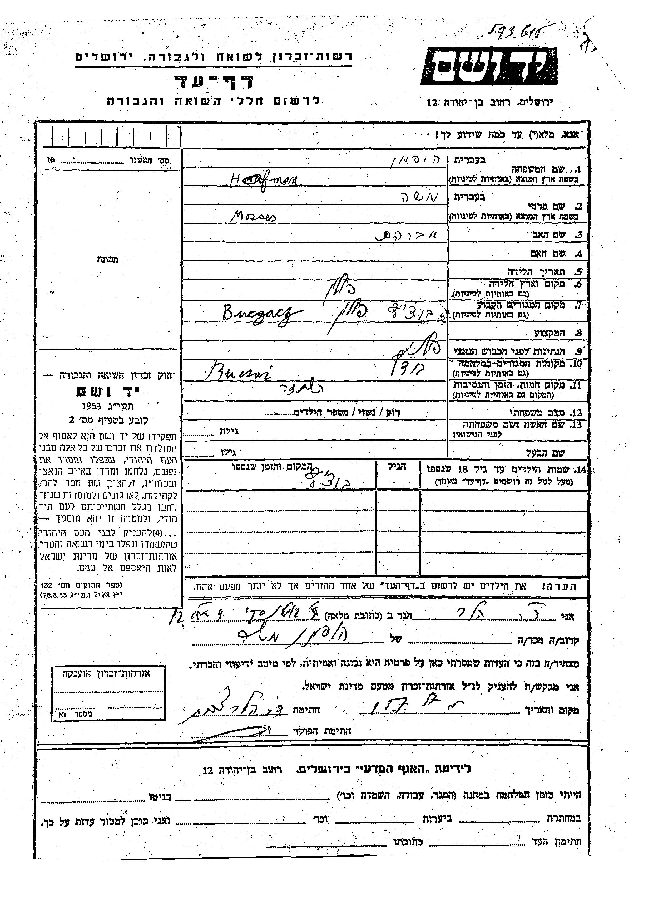 Hofman Mozses Buczacz, Pologne Feuille de témoignage
