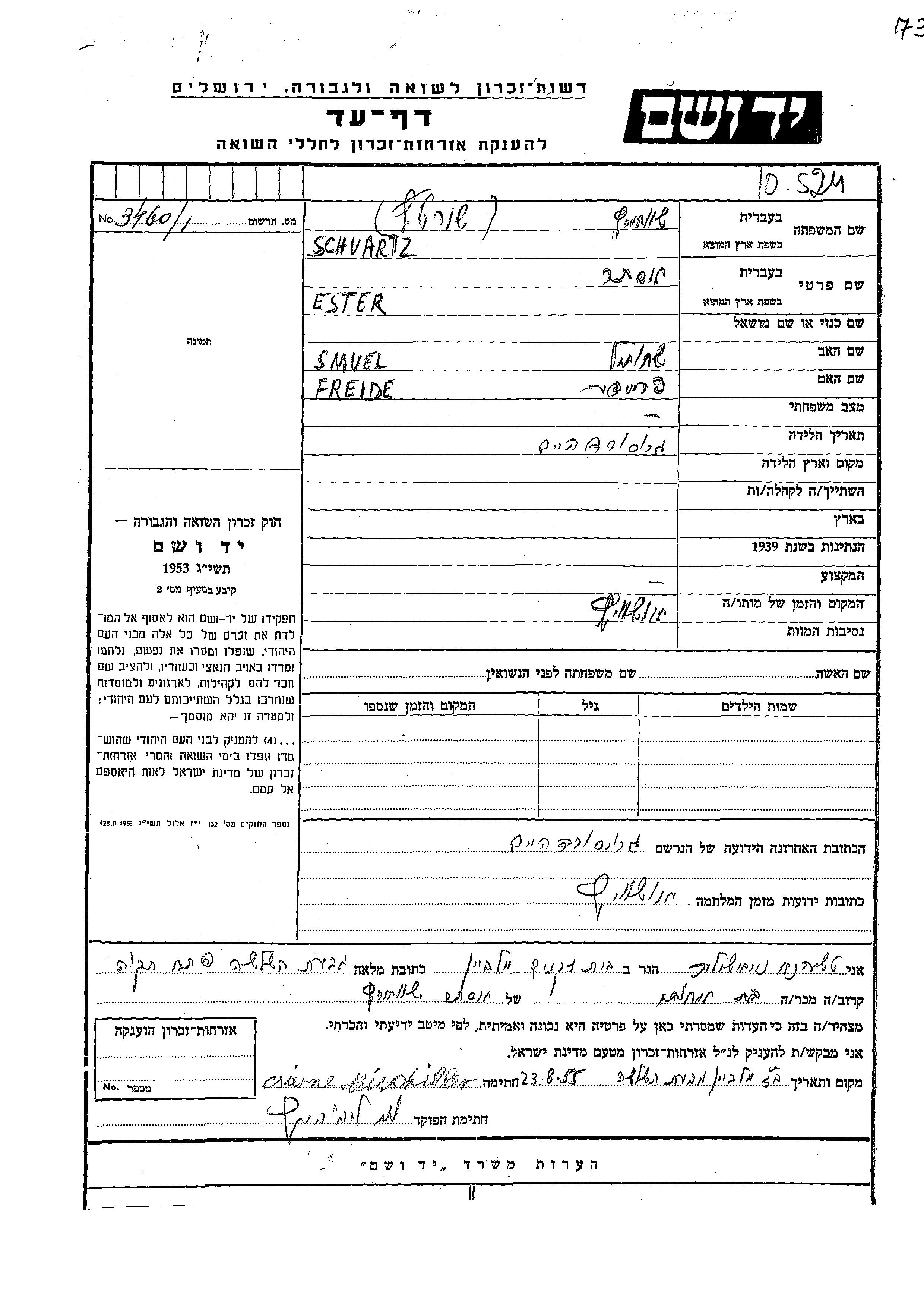 Schvartz Ester endroit inconnu, Feuille de témoignage