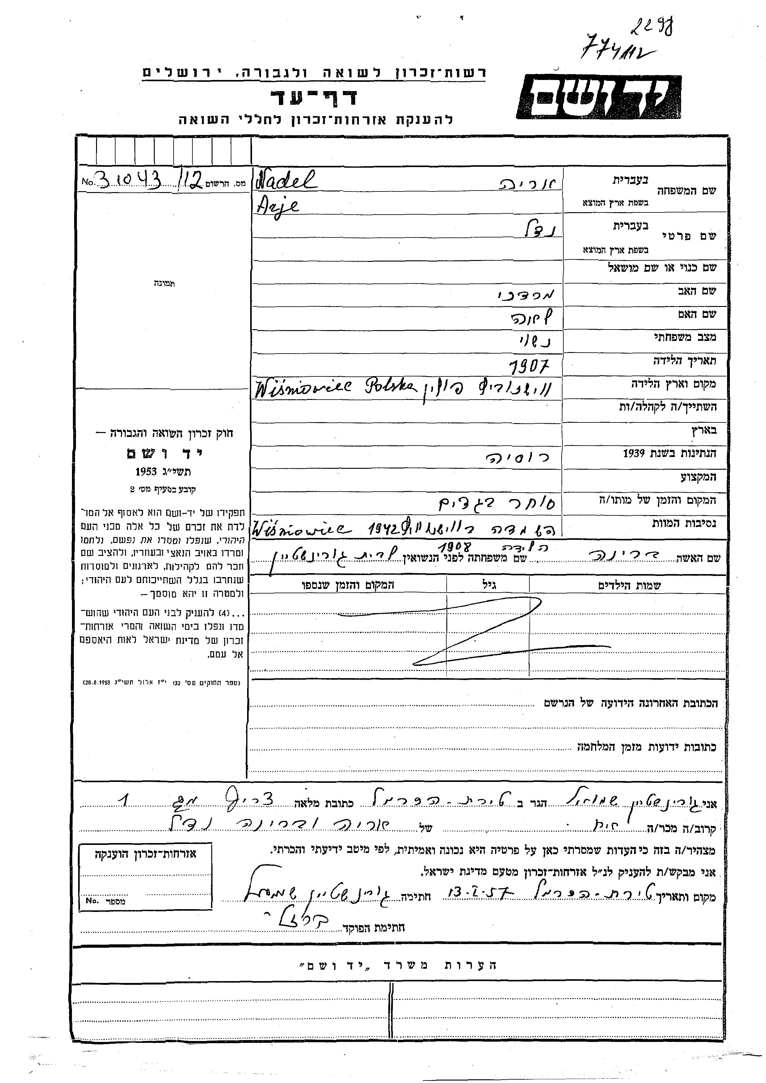 Nadel Arje 1907 endroit inconnu, Feuille de témoignage