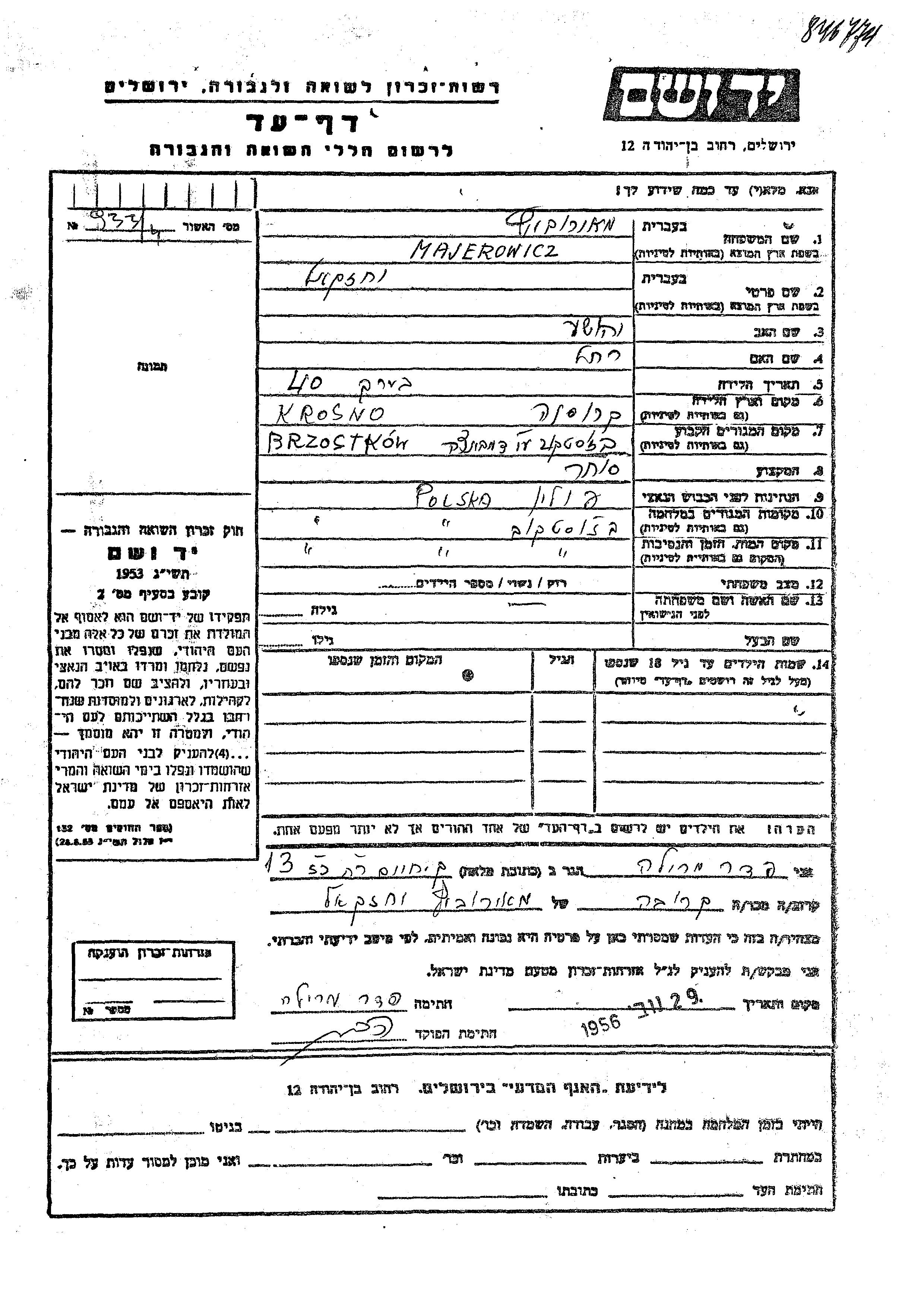 Majerowicz Yekhezkel Brzesko, Pologne Feuille de témoignage