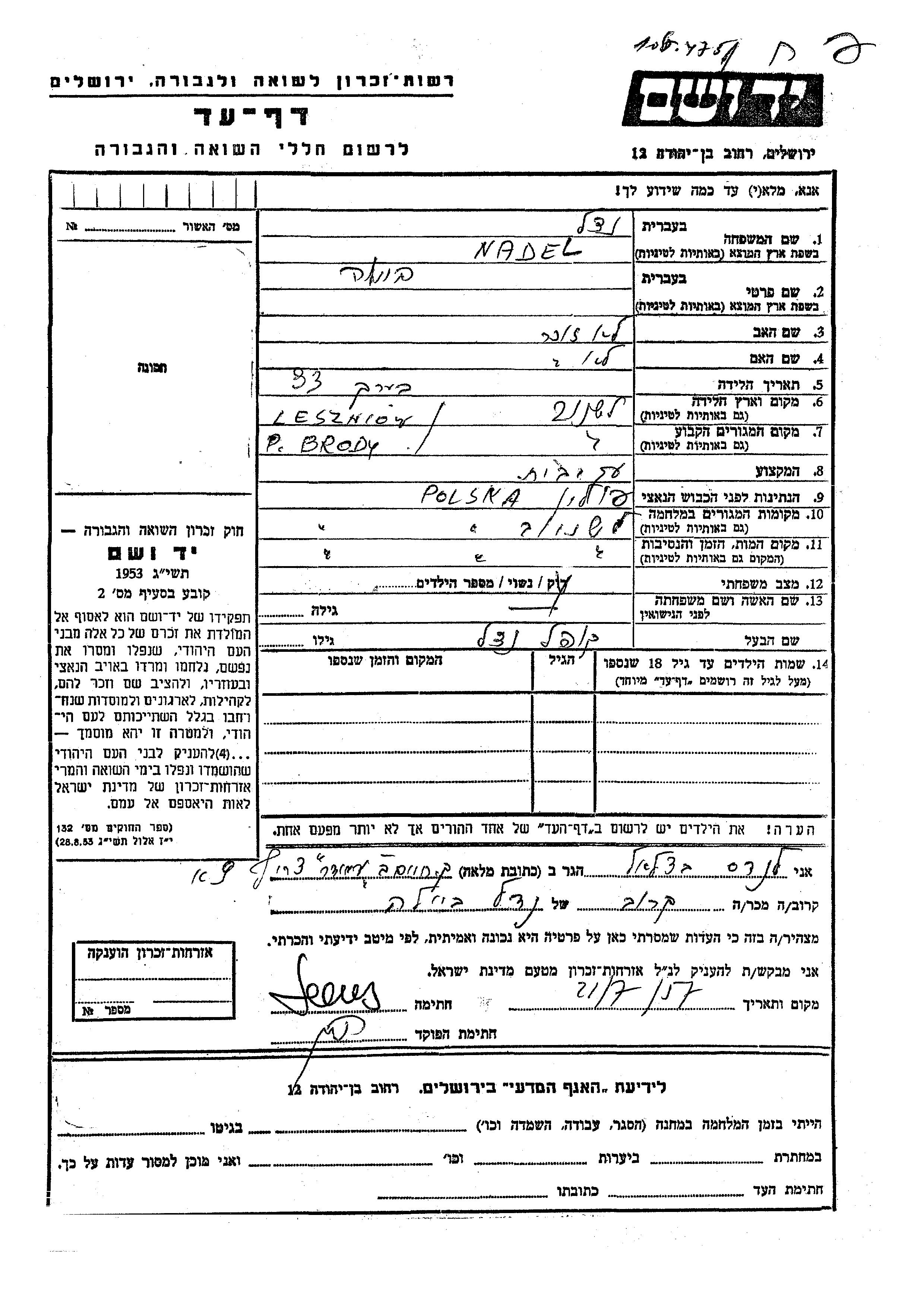Nadel Beila Leszniow, Pologne Feuille de témoignage