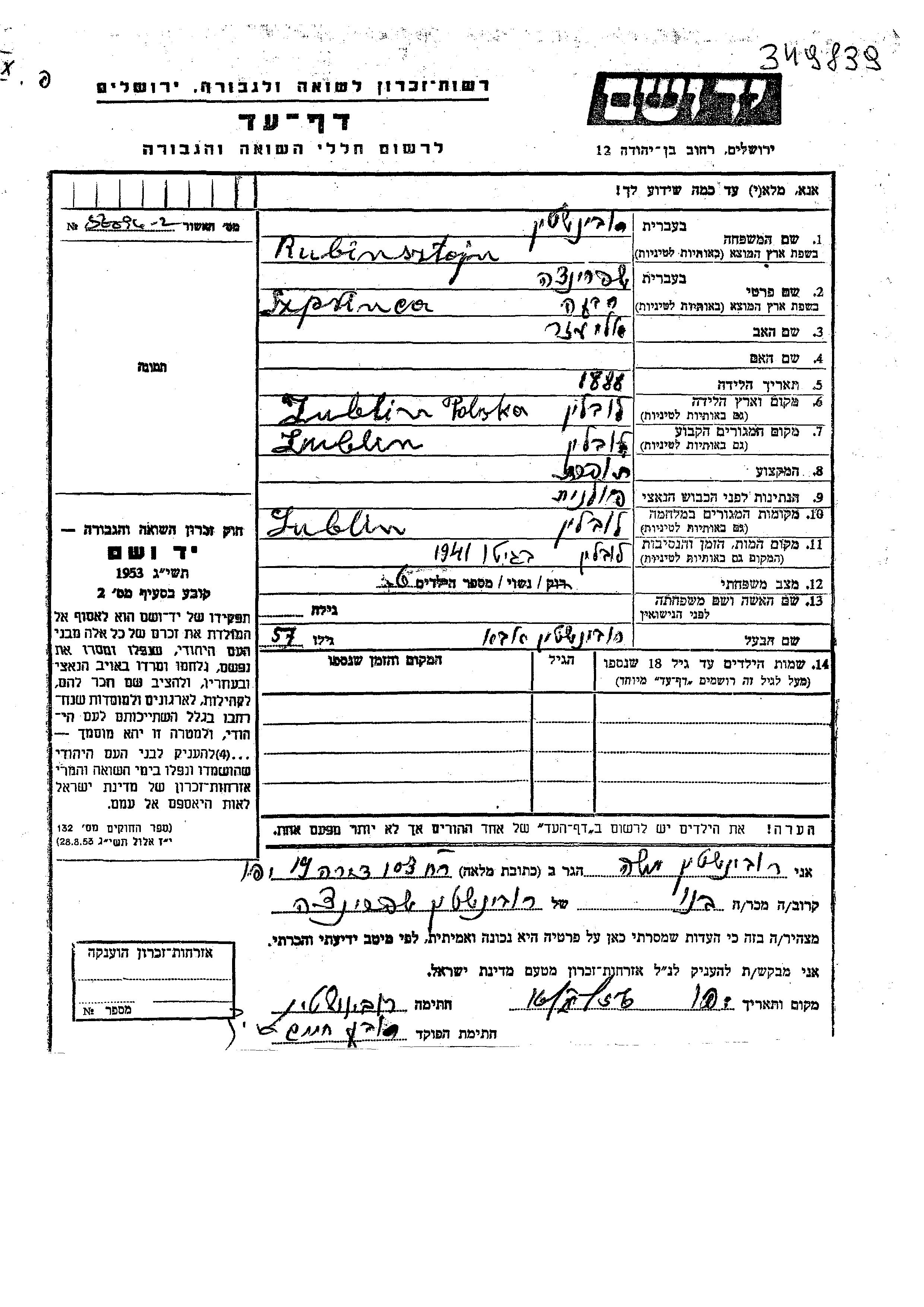 Rubinsztajn Szprinca 1888 Lublin, Pologne Feuille de témoignage