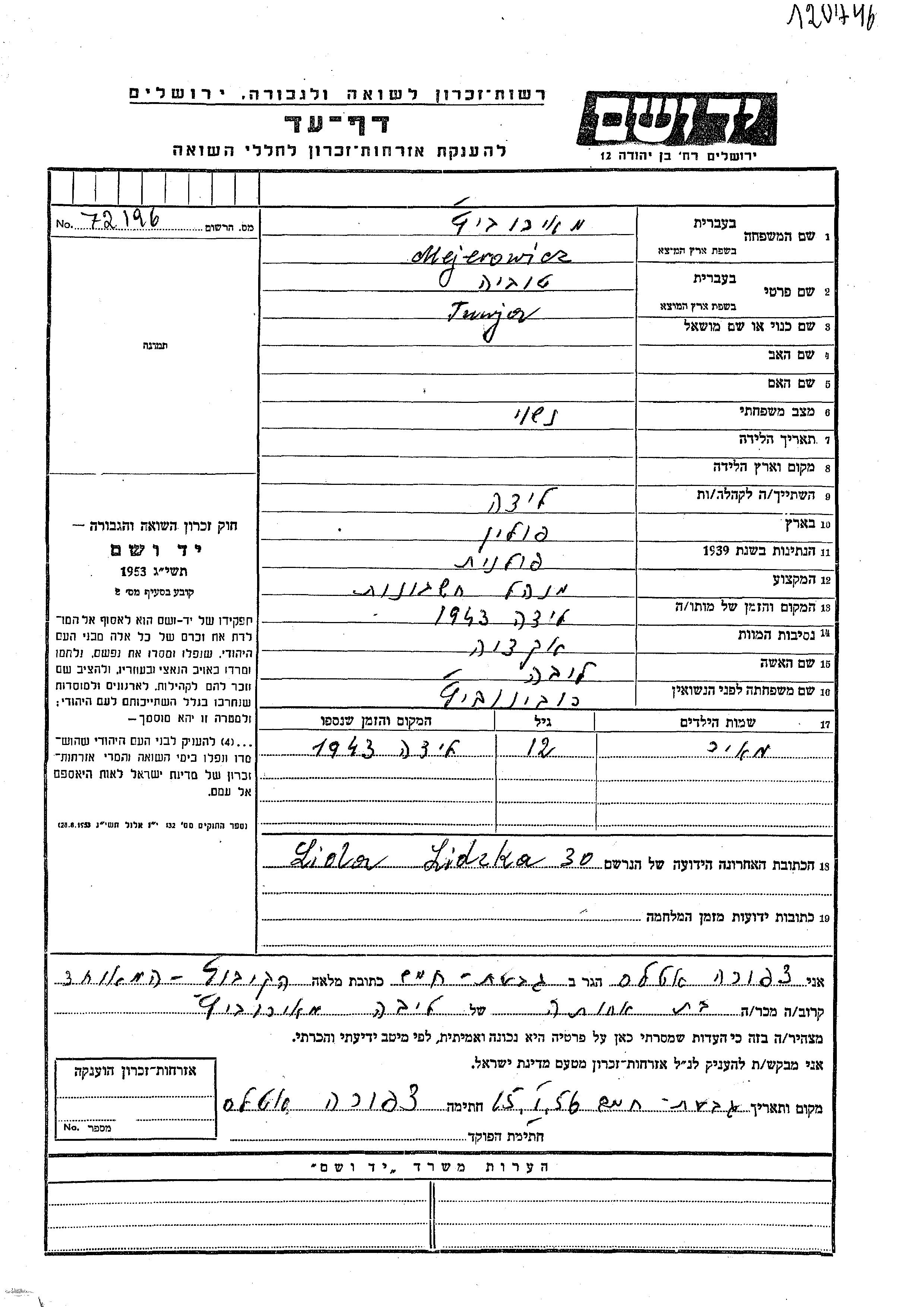 Mejerowicz Tuwja Lida, Pologne Feuille de témoignage