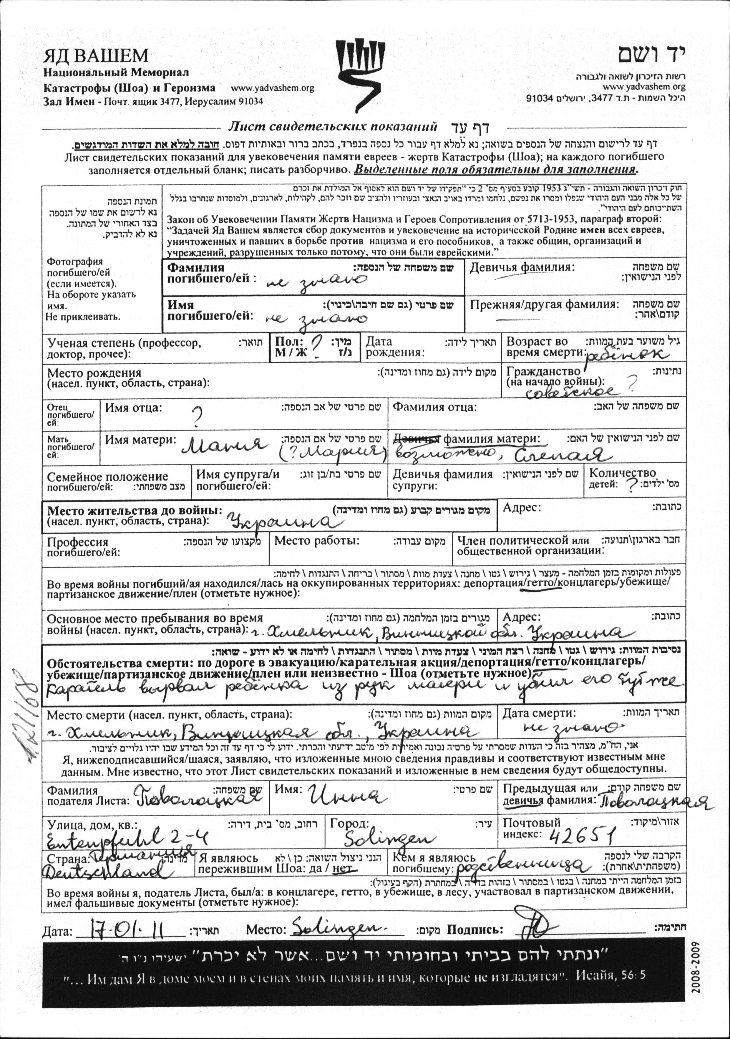nom inconnu prénom inconnu Ukraine (URSS) Feuille de témoignage