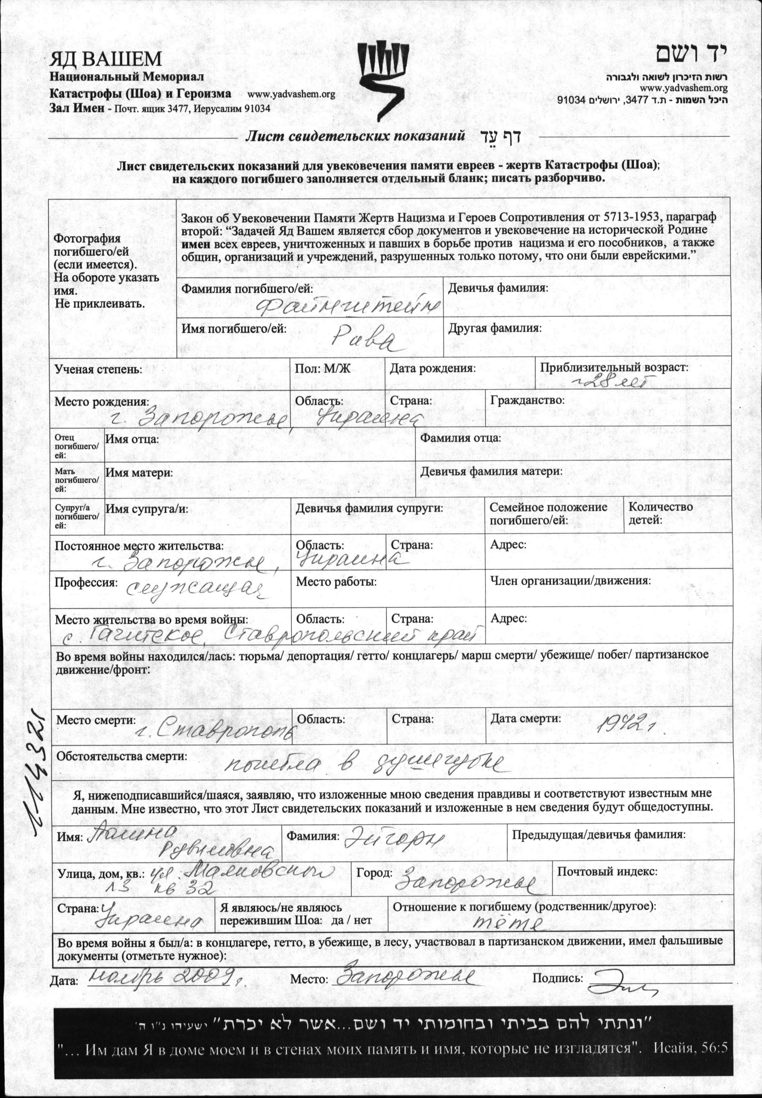 Fainshteyn Riva Zaporozhye, Ukraine (URSS) Feuille de témoignage