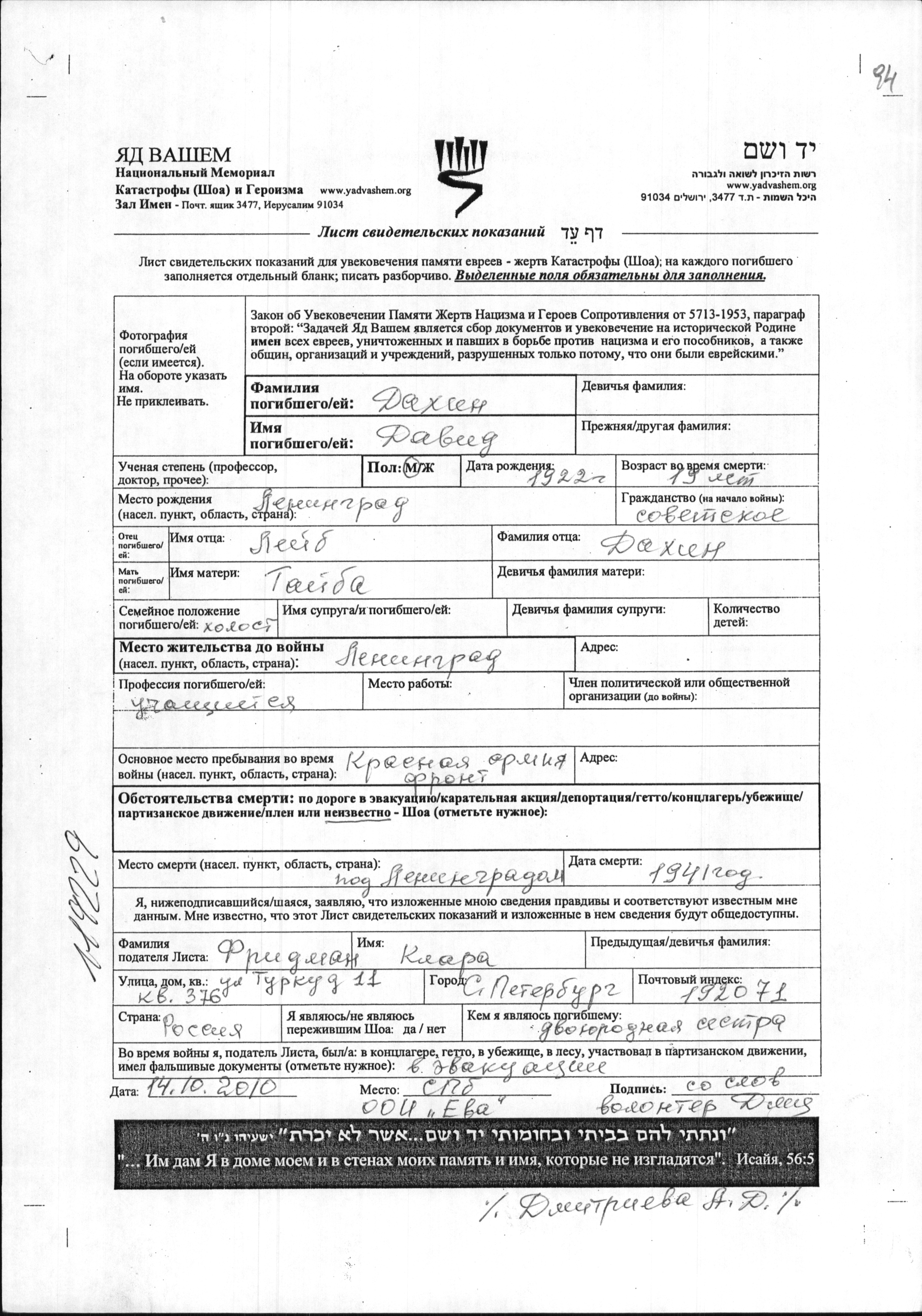Dakhin David 1922 Leningrad, Russie (URSS) Feuille de témoignage