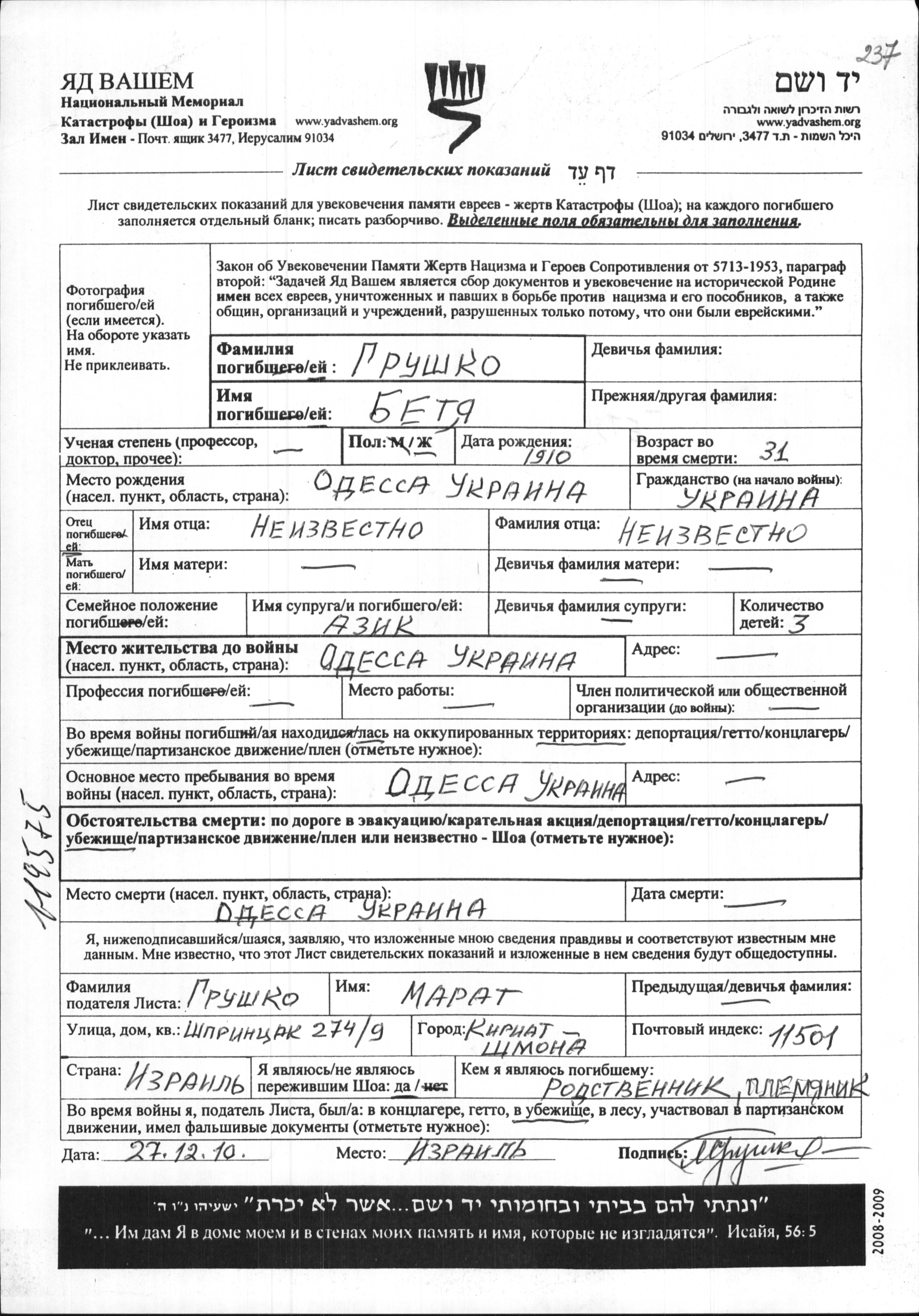 Yad Vashem - Pages of Testimony Names Memorial Collection