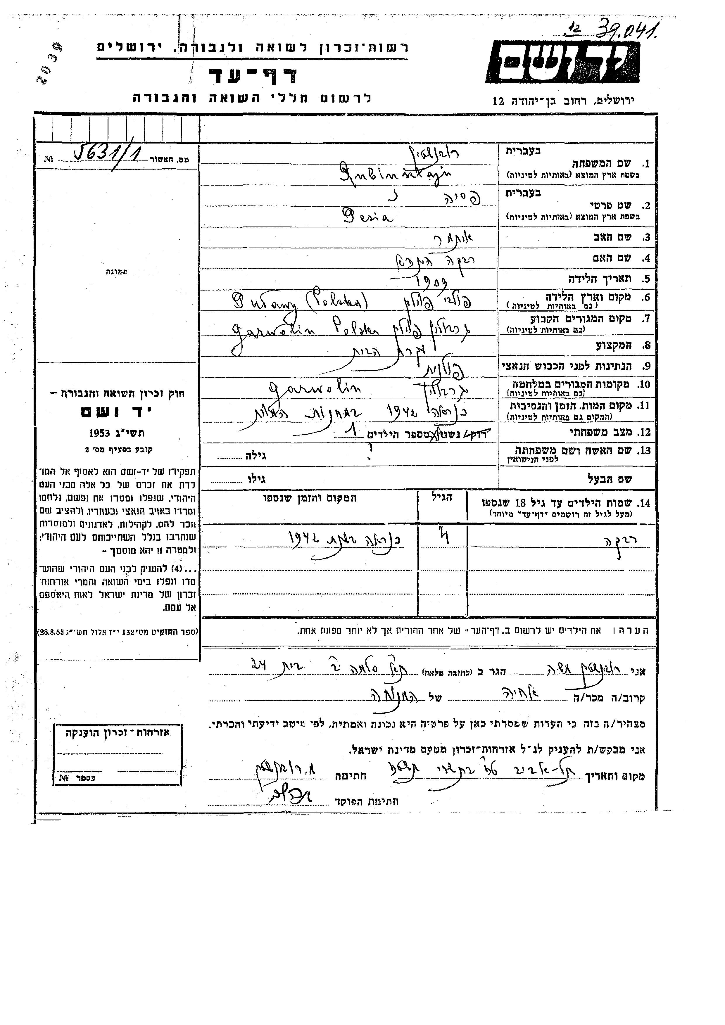 Yad Vashem - Pages of Testimony Names Memorial Collection