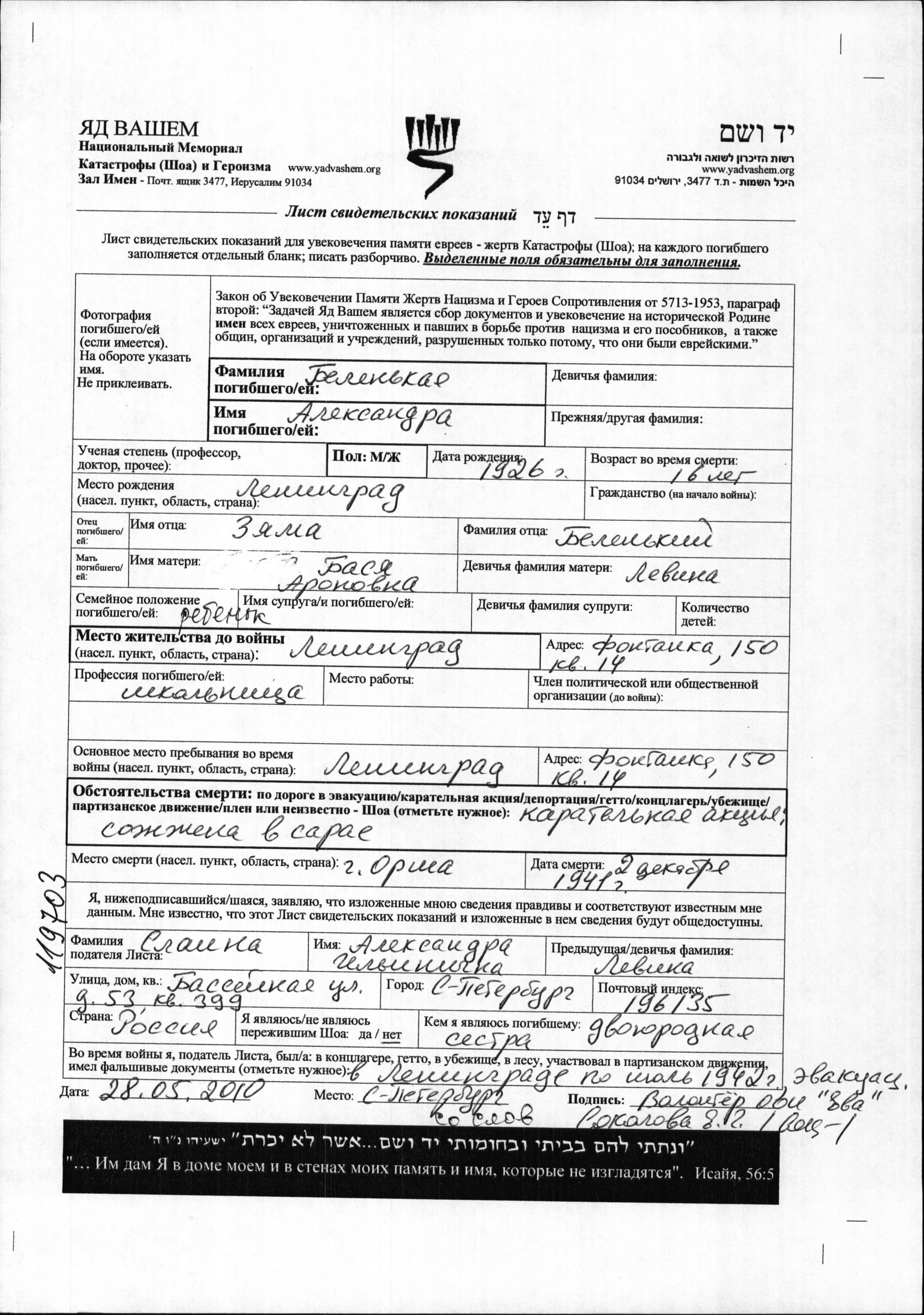 Belenkaya Aleksandra 1926 Leningrad, Russie (URSS) Feuille de témoignage
