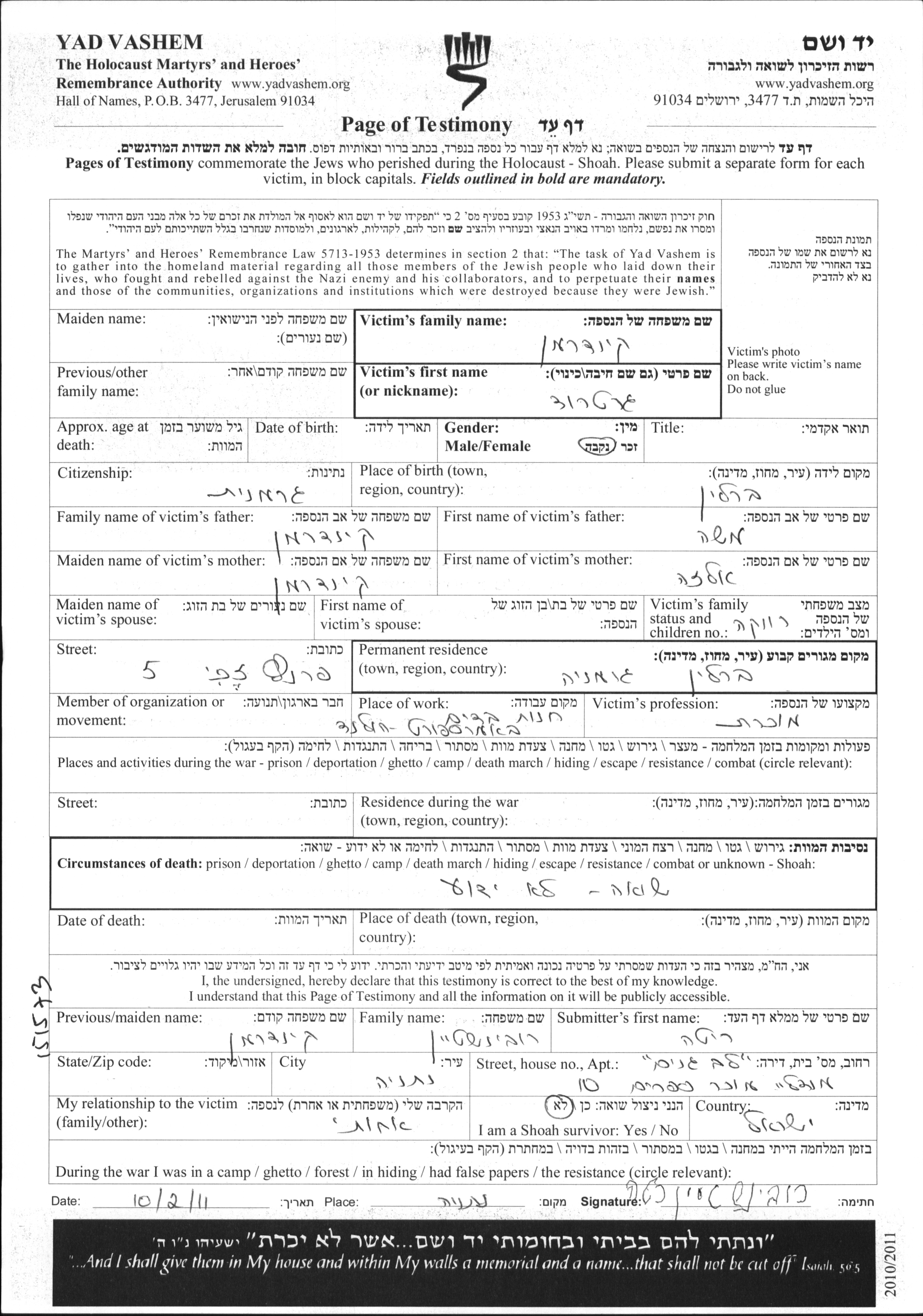 Yad Vashem - Pages of Testimony Names Memorial Collection