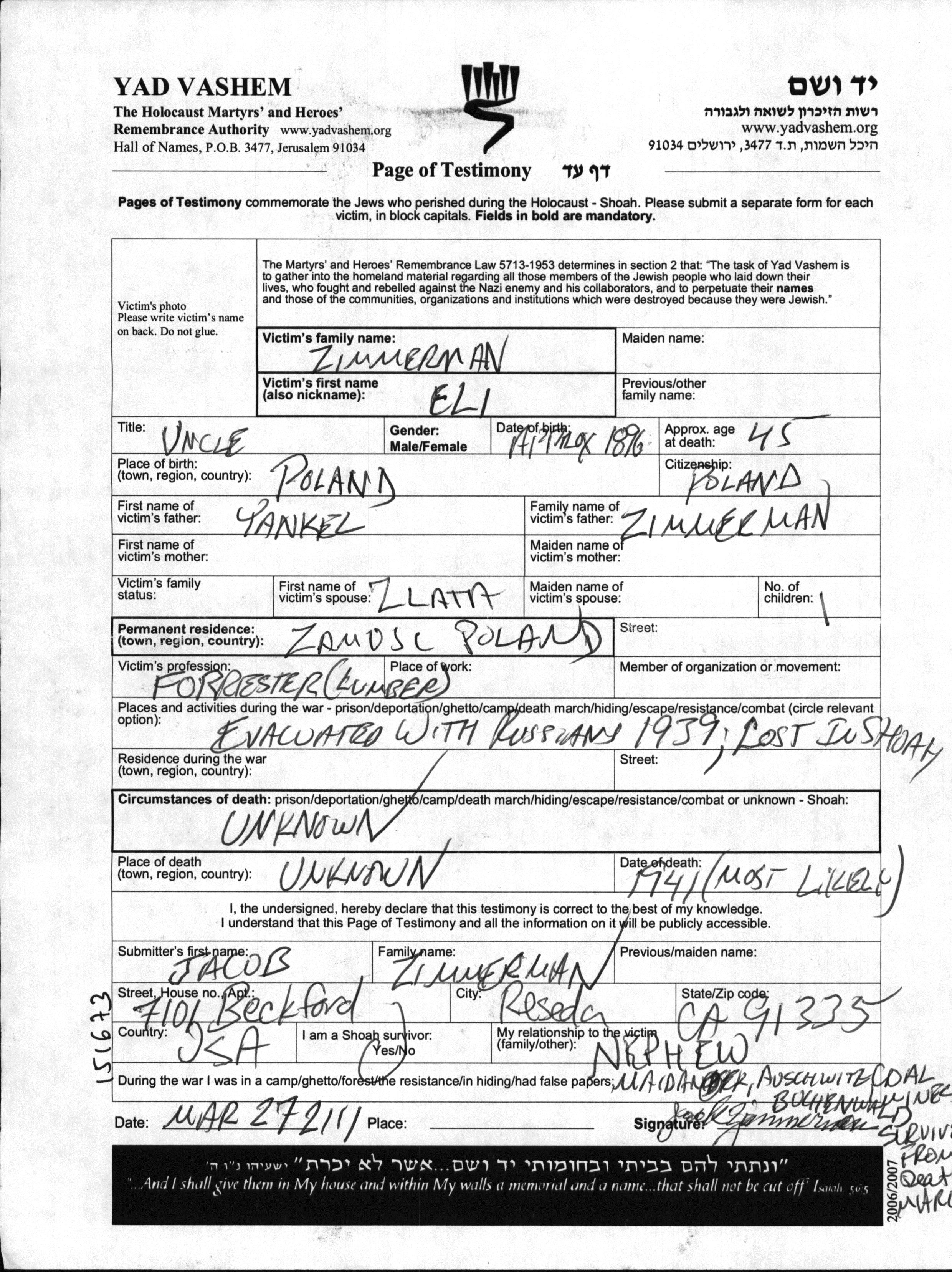 Eli Zimmerman est né à Pologne en 1896, fils de Yankel. Il était Lumber et Mariée à Zlata. Avant la seconde guerre mondiale il vivait à Zamosc, Pologne.