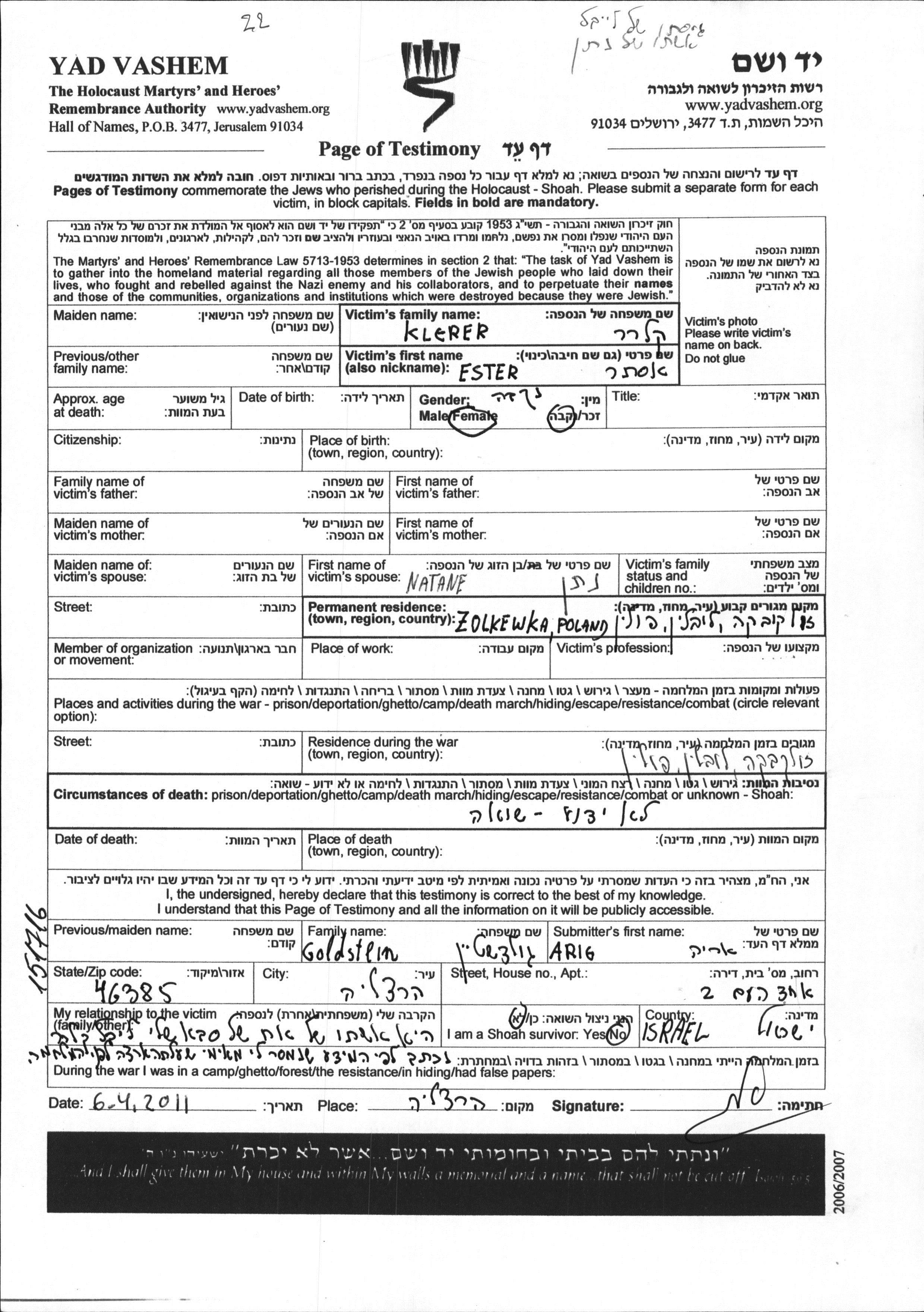 Klerer Ester Zolkiewka, Pologne Feuille de témoignage