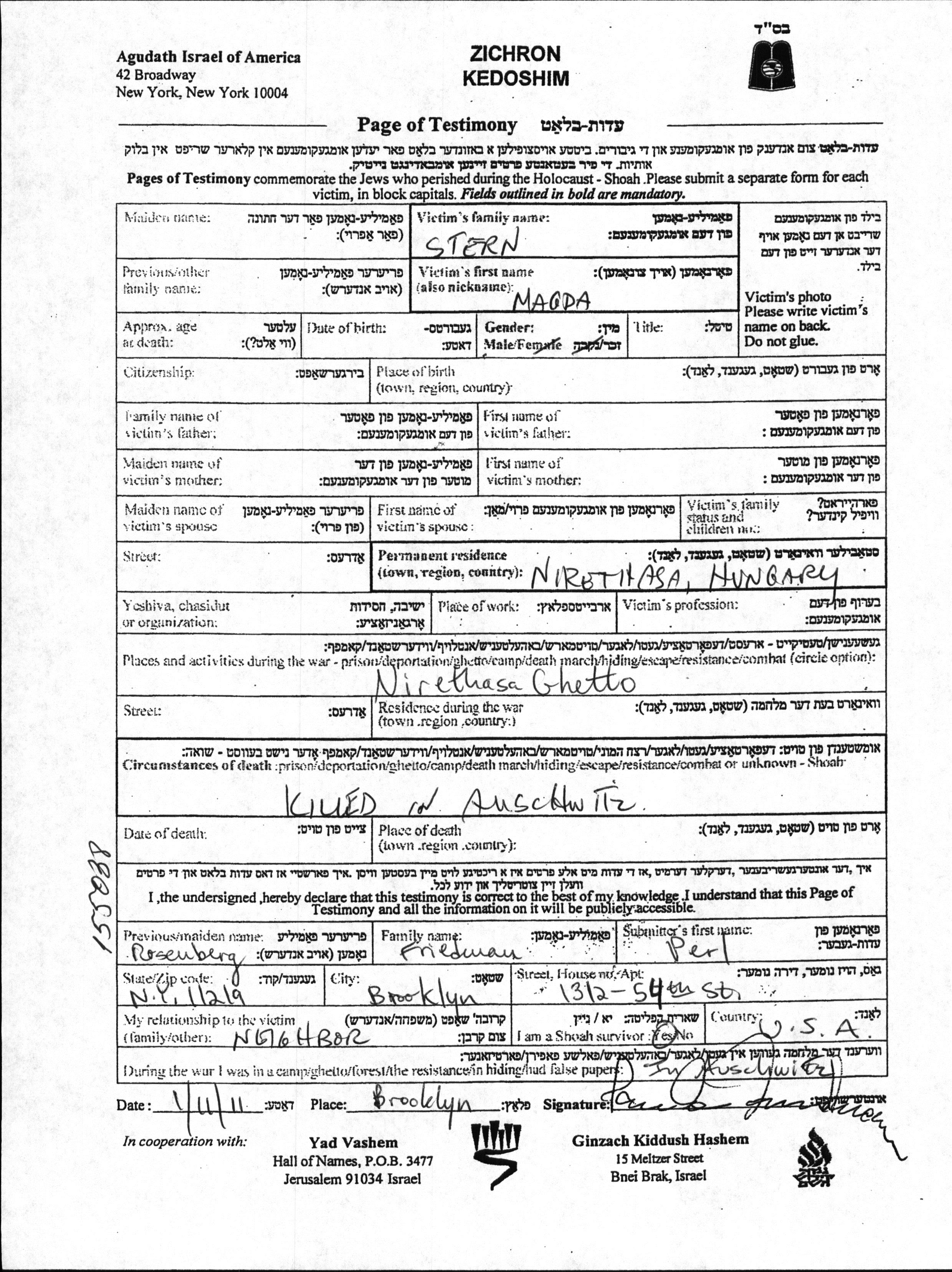 Stern Magda Nirethaza, Hongrie Feuille de témoignage