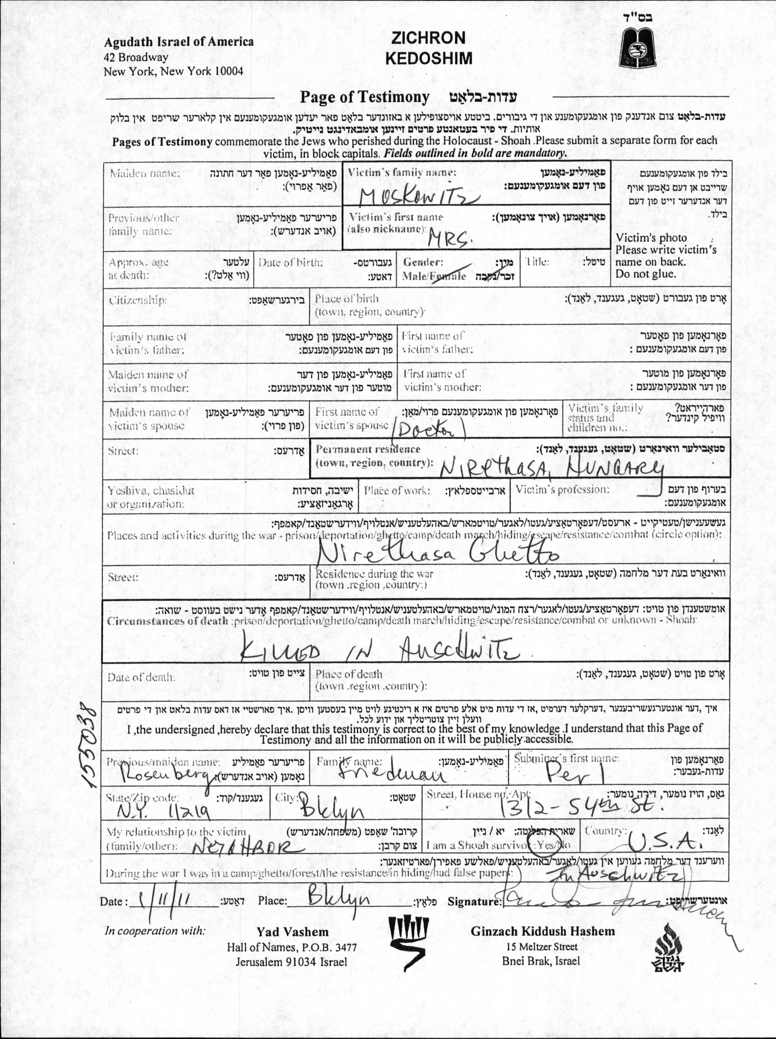 prénom inconnu Moskowitz. Avant la seconde guerre mondiale elle vivait à Nirethaza, Hongrie. Pendant la guerre, elle était à Ghetto.