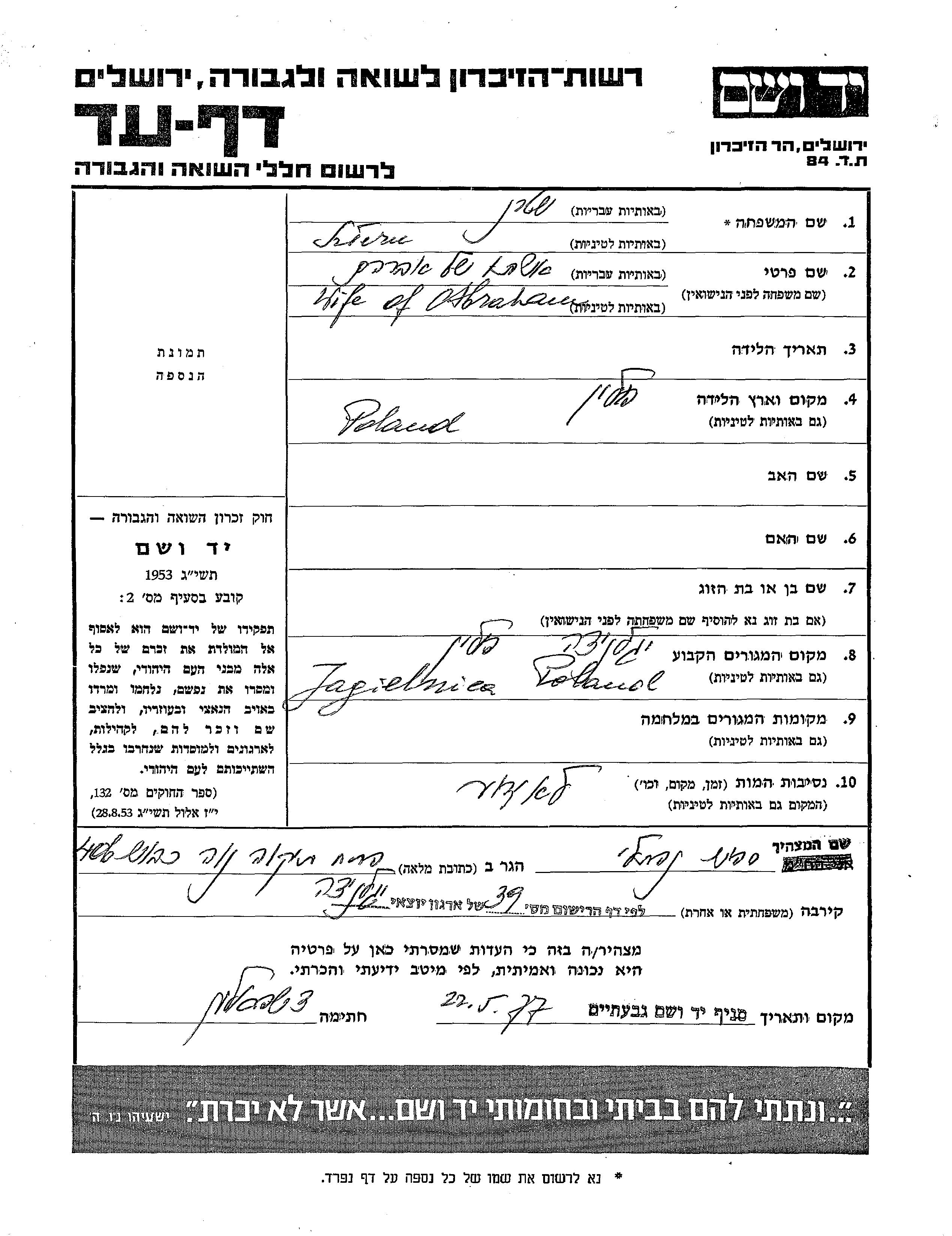 Yad Vashem - Pages of Testimony Names Memorial Collection