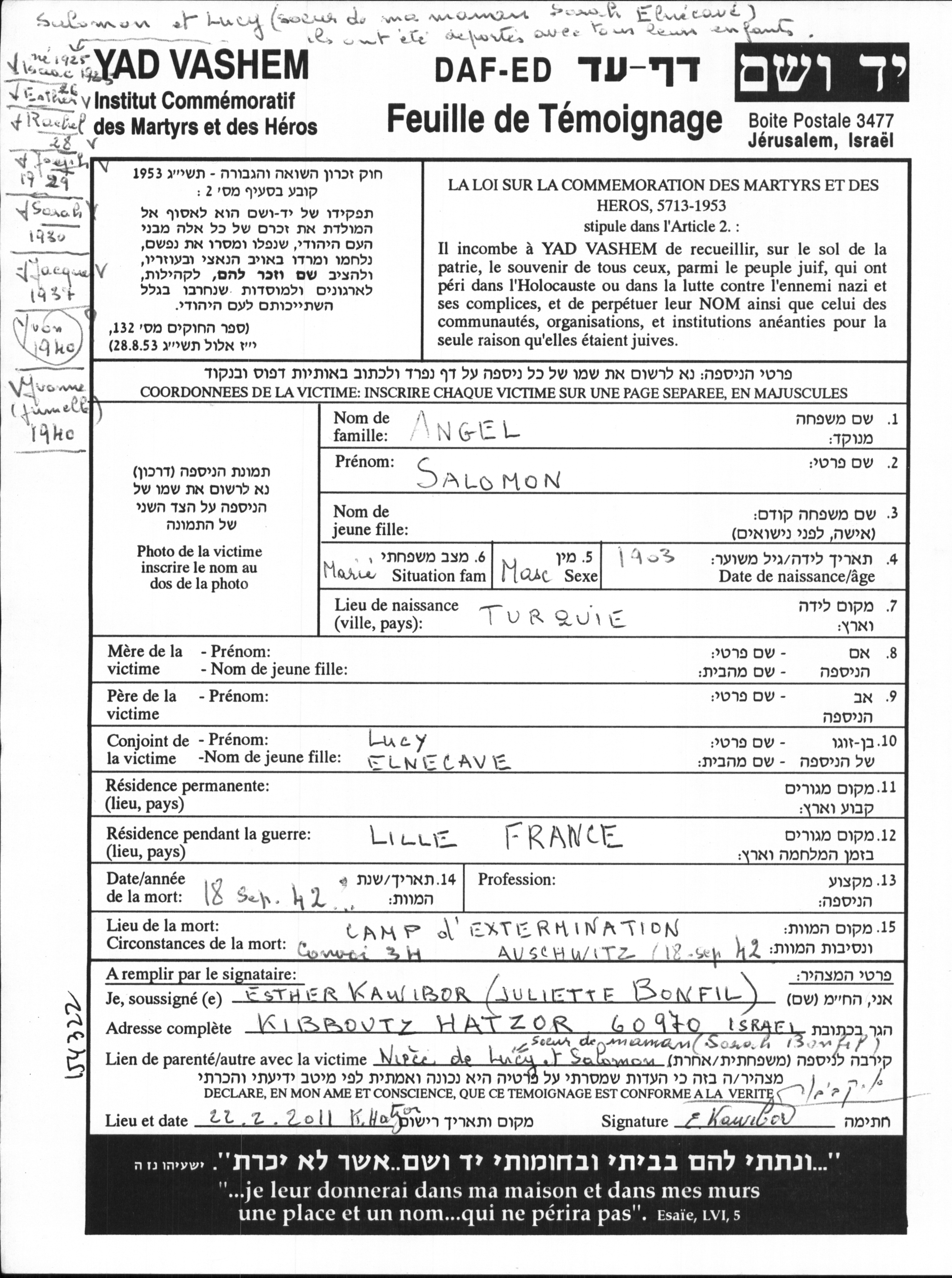 Salomon Angel est né à Turquie en 1903. Il était Mariée à Lucy née Elnecave. Au cours de la guerre, il était à Lille, France. Salomon a été assassiné pendant la Shoah. Lieu de la mort: Auschwitz, Pologne en 18/09/1942.