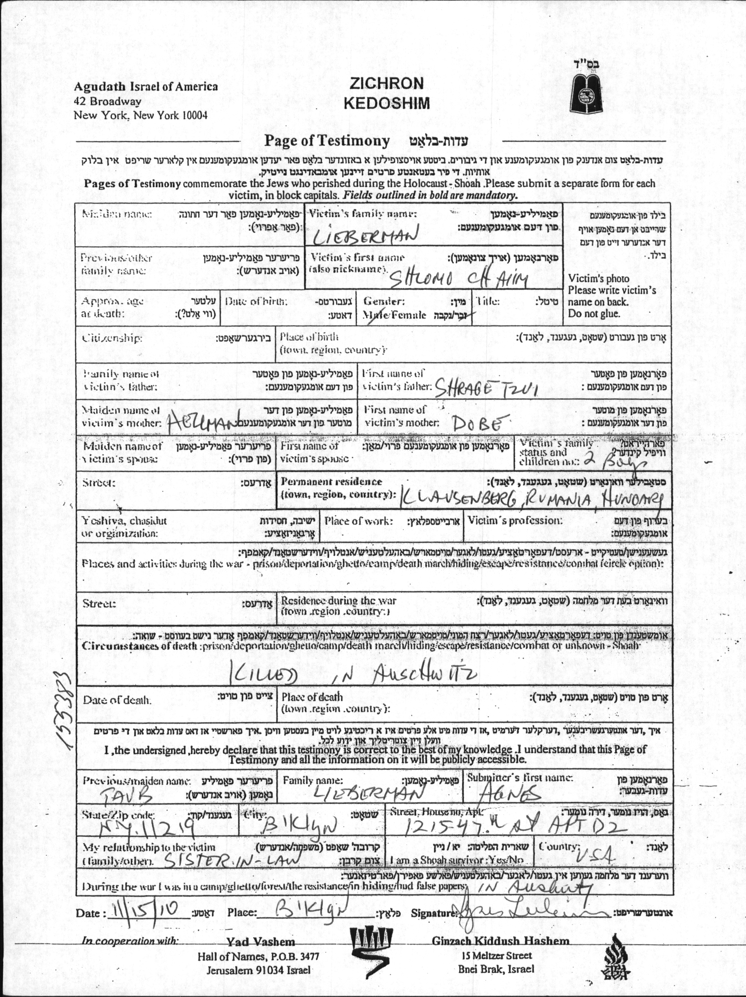 Lieberman Shlomo Chaim Klausenberg, Roumanie Feuille de témoignage