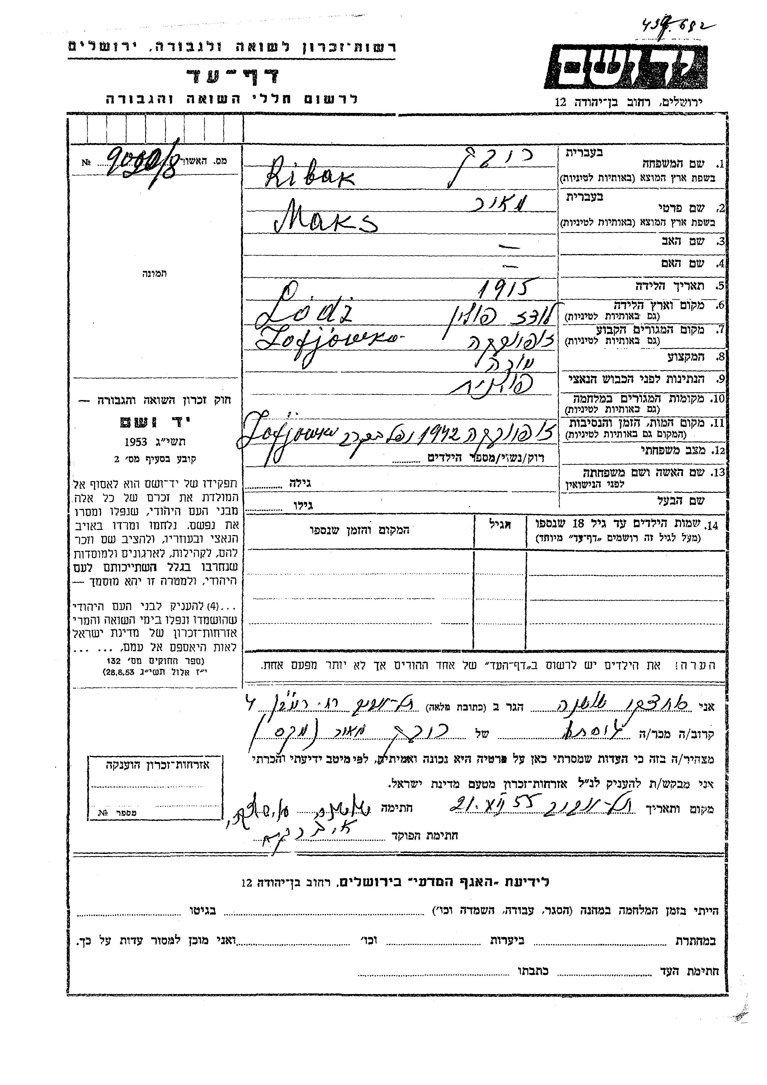 Ribak Max Meir 1915 Zofjówka, Pologne Feuille de témoignage