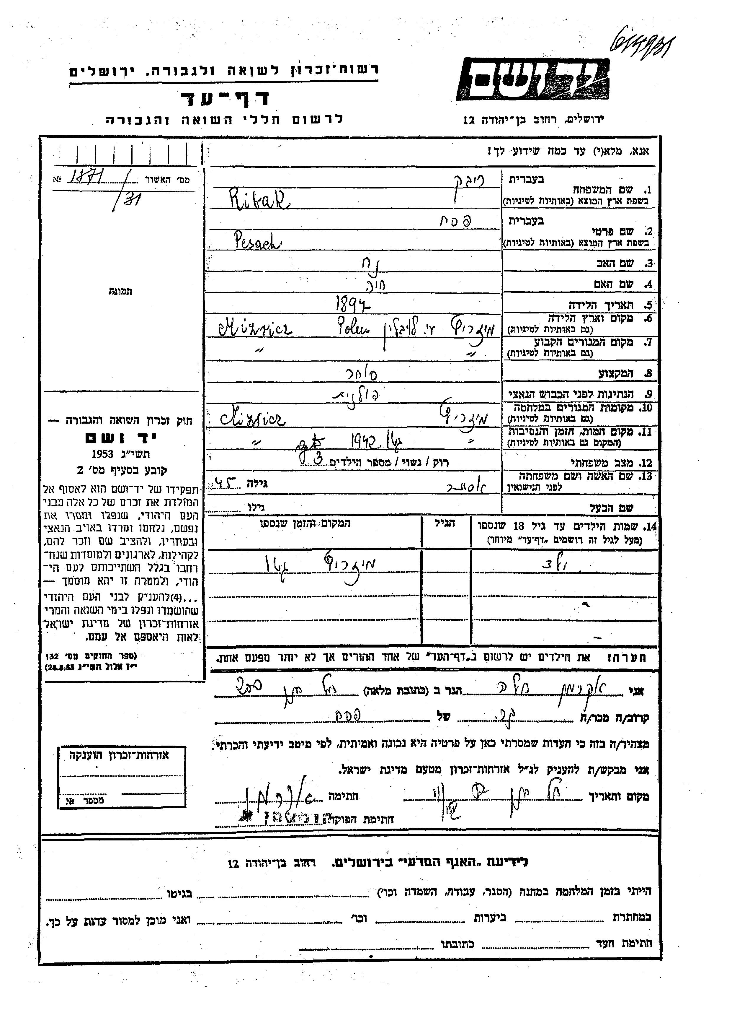 Pesach Ribak est né à Miedzyrzec, Pologne en 1897, fils de Noakh et de Khaia. Il était Commerçant/e et Mariée à Ester. Avant la seconde guerre mondiale il vivait à Miedzyrzec, Pologne. Au cours de la guerre, il était à Miedzyrzec, Pologne. Pesach a été assassiné pendant la Shoah. Lieu de la mort: Miedzyrzec, Pologne en 1942.