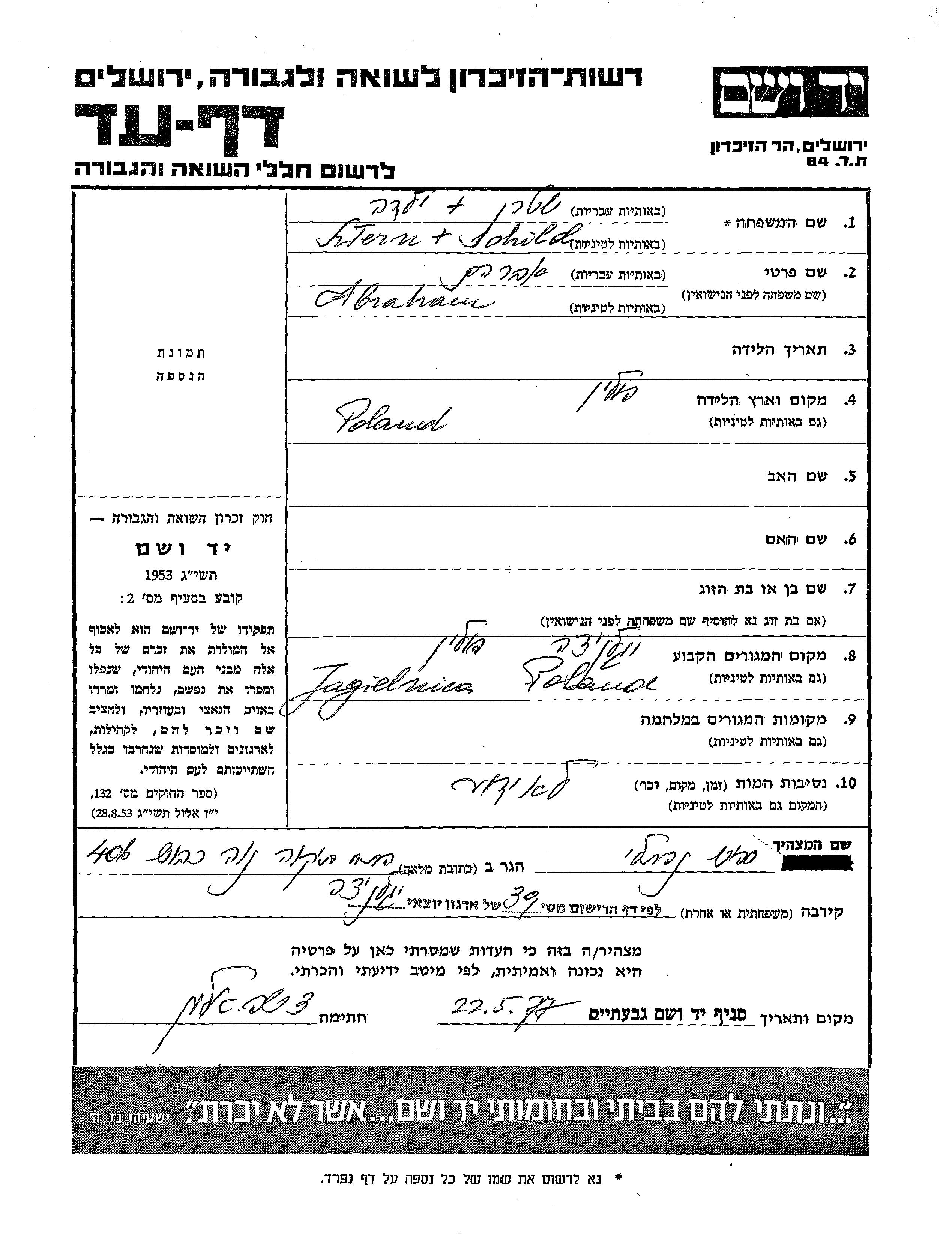 Sztern Abraham Jagielnica, Pologne Feuille de témoignage