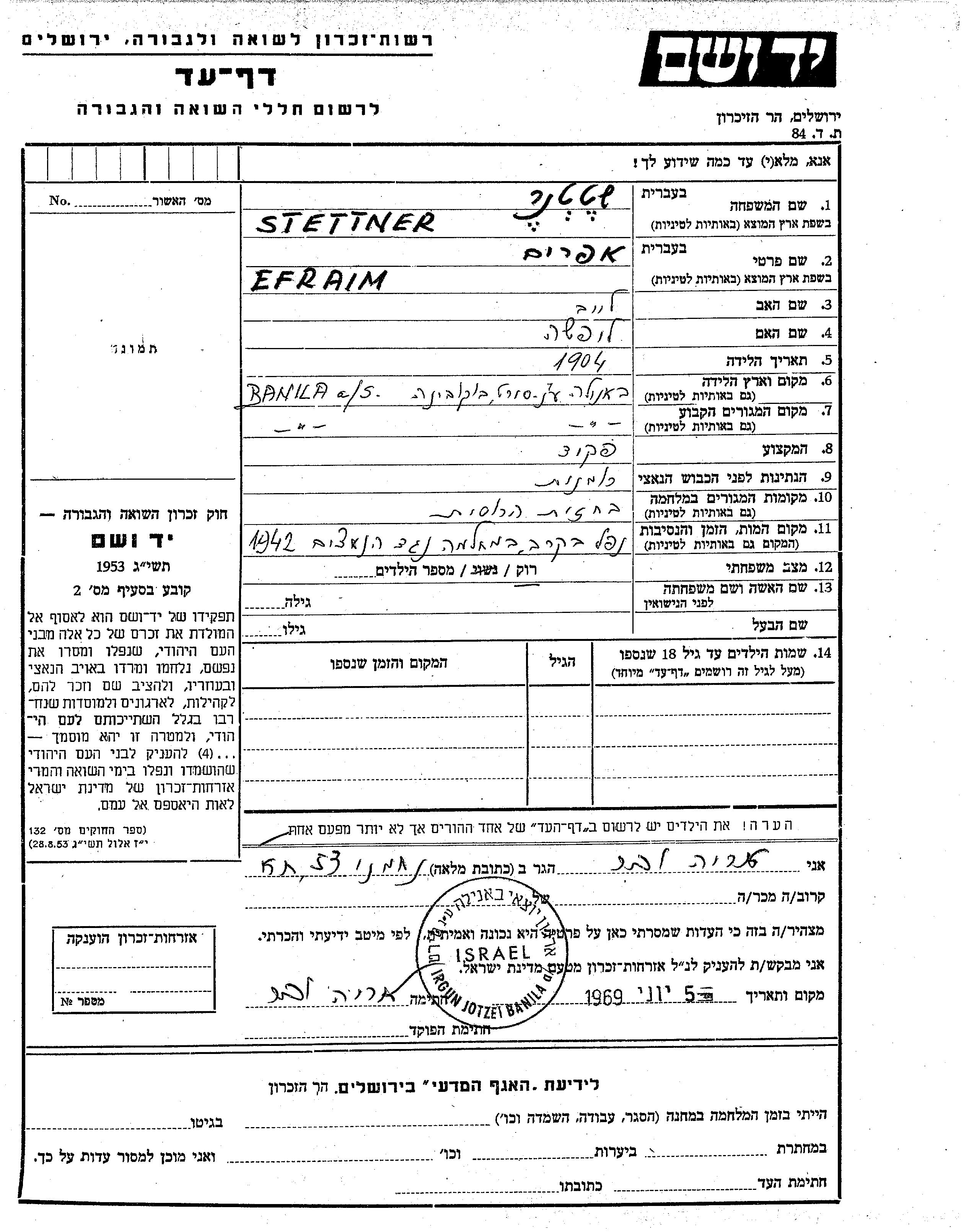 Stettner Efraim 1904 Banila, Roumanie Feuille de témoignage