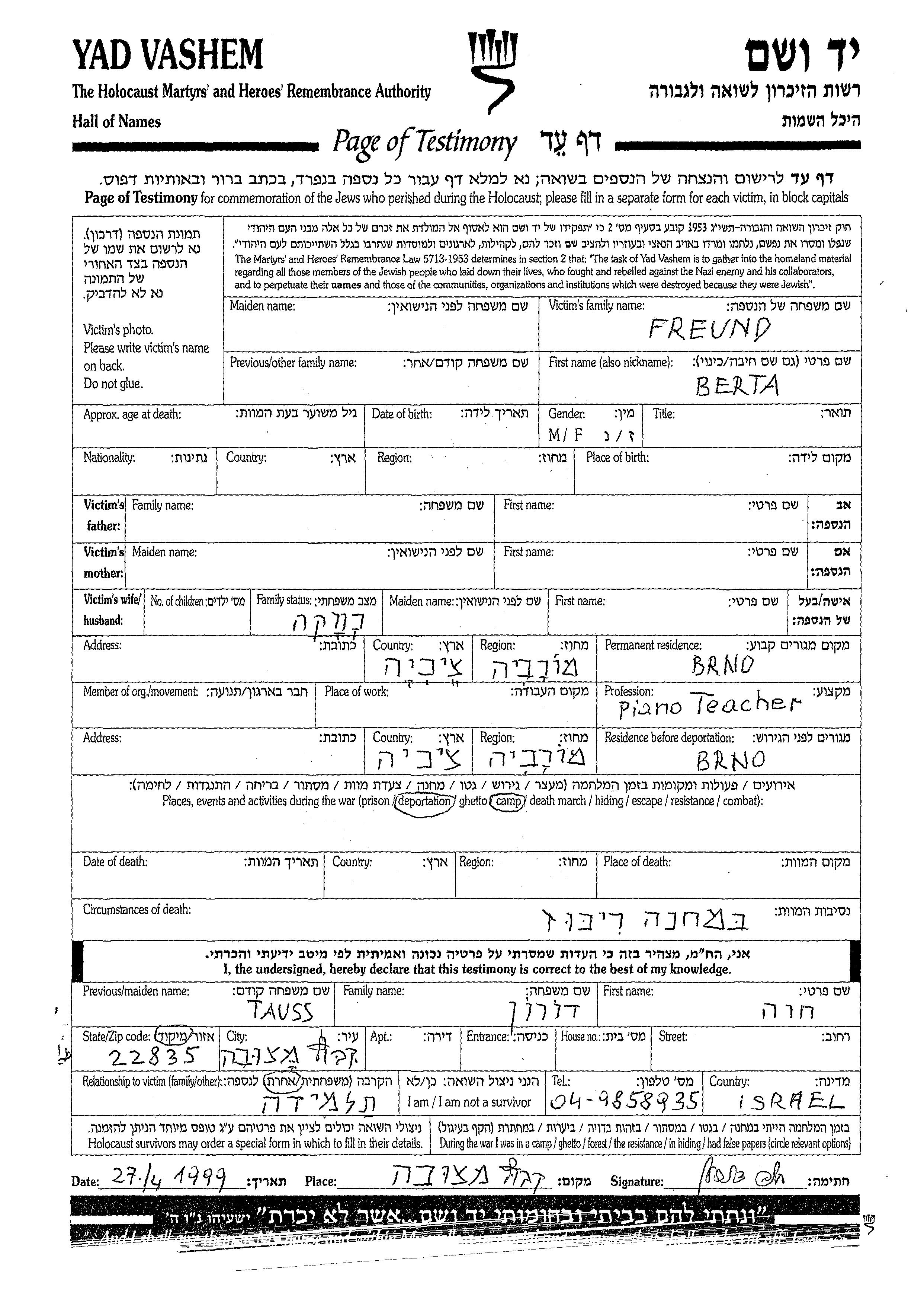 Freund Berta Brno, Tchécoslovaquie Feuille de témoignage