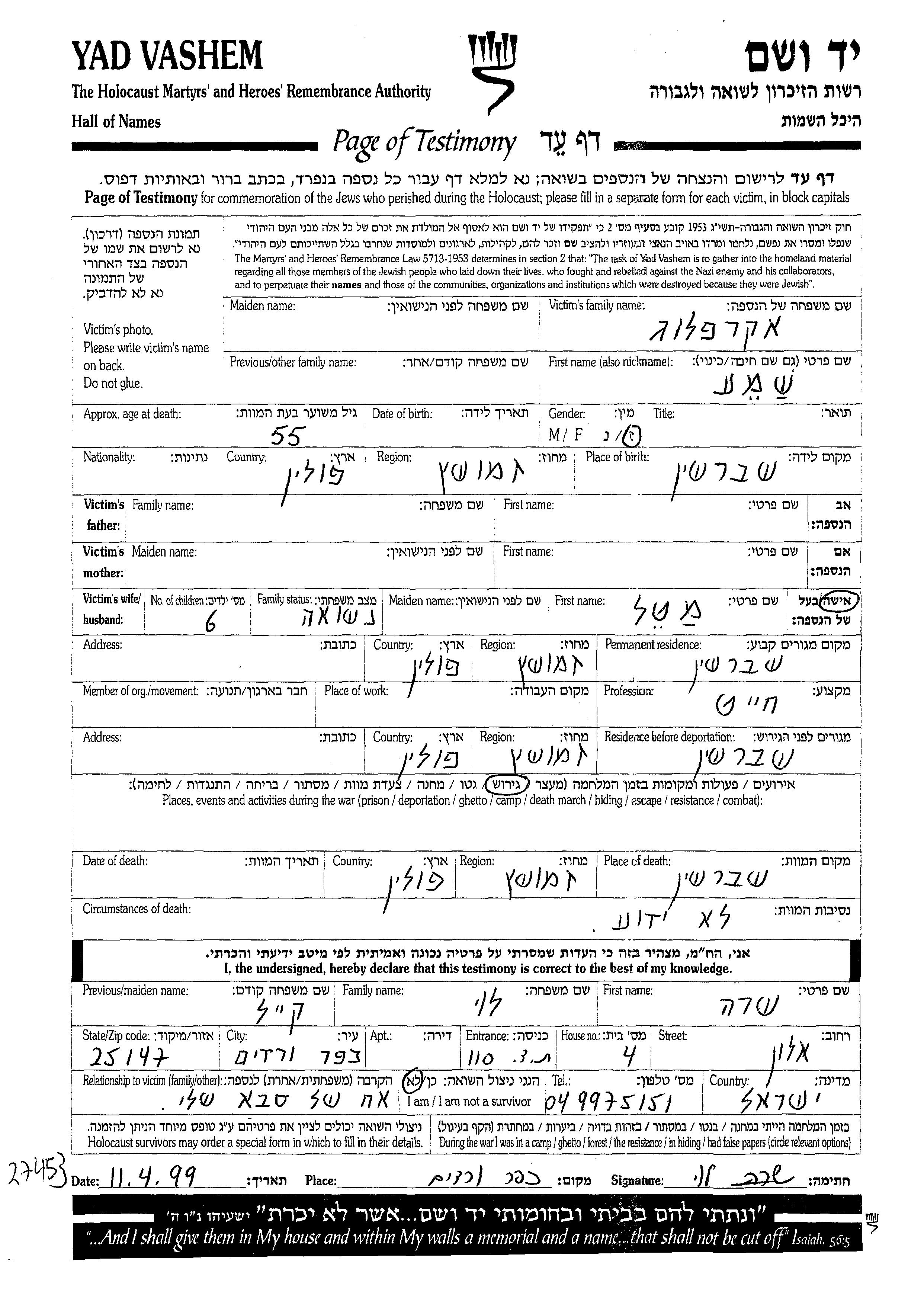 Yad Vashem - Pages of Testimony Names Memorial Collection