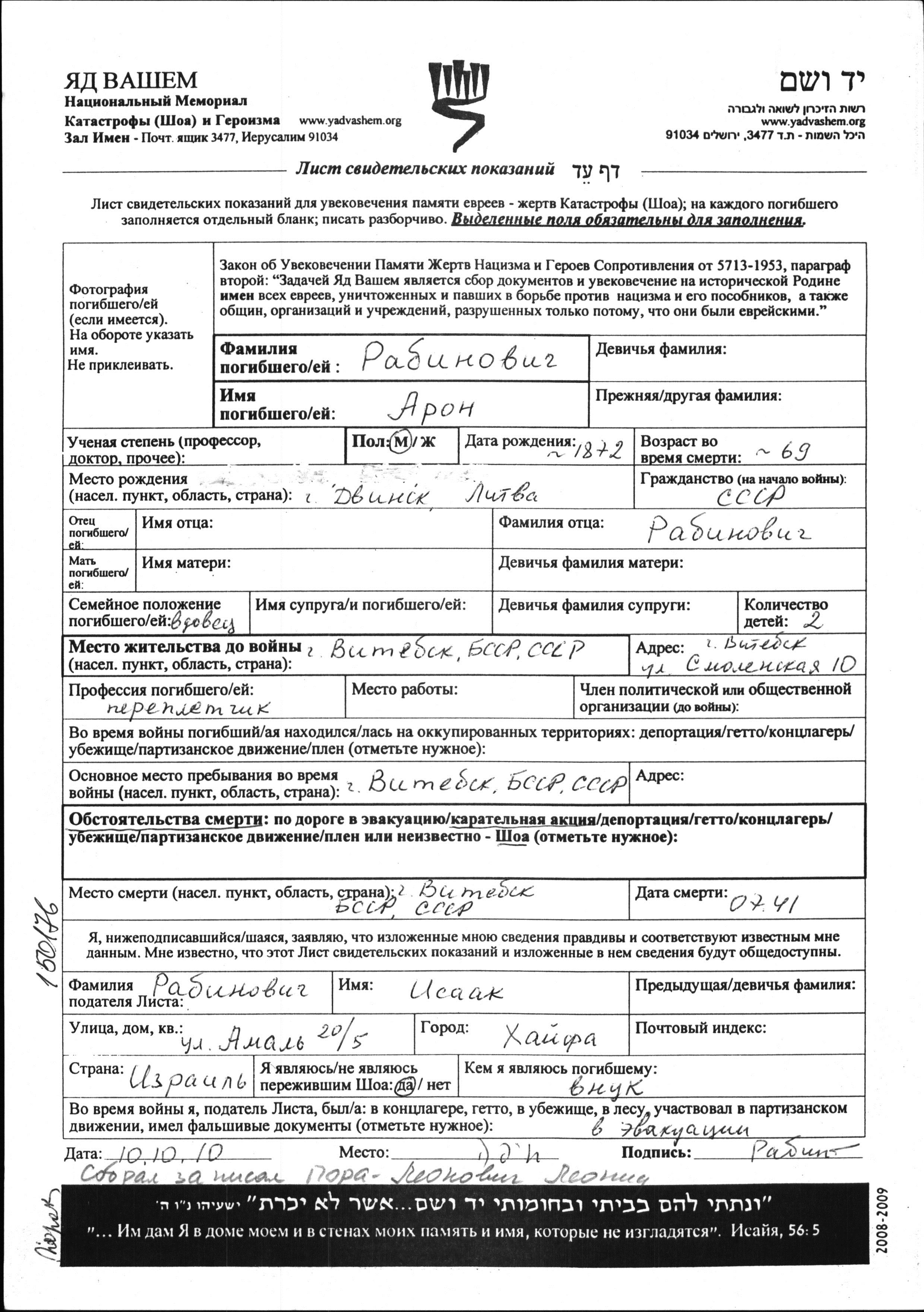 Aron Rabinovich est né à Dvinsk, Lettonie en 1872. Il était Relieur et veuf. Avant la seconde guerre mondiale il vivait à Vitebsk, Bélorussie (URSS). Au cours de la guerre, il était à Vitebsk, Bélorussie (URSS).