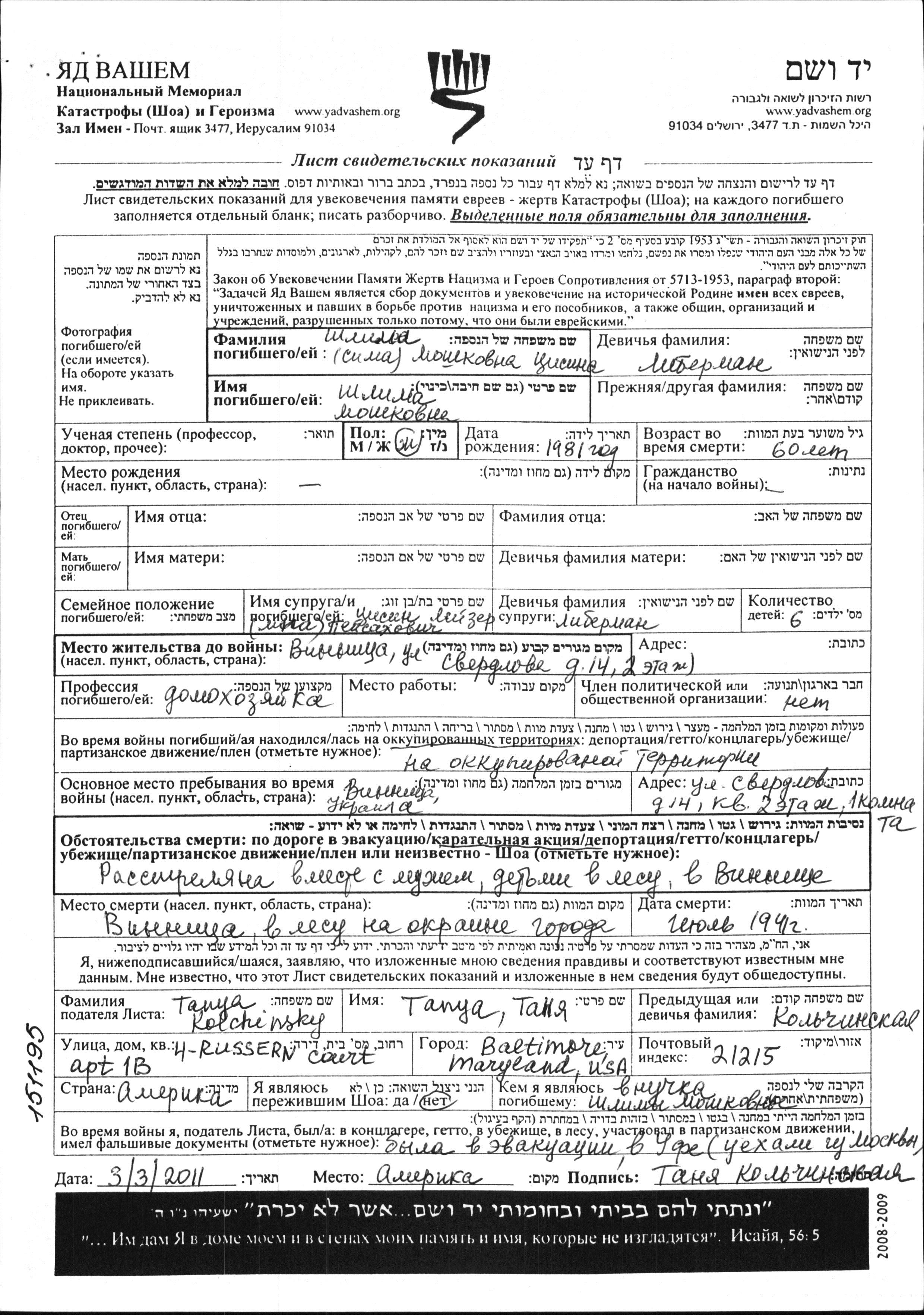 Tzisina Shlima 1891 Vinnitsa, Ukraine (URSS) Feuille de témoignage