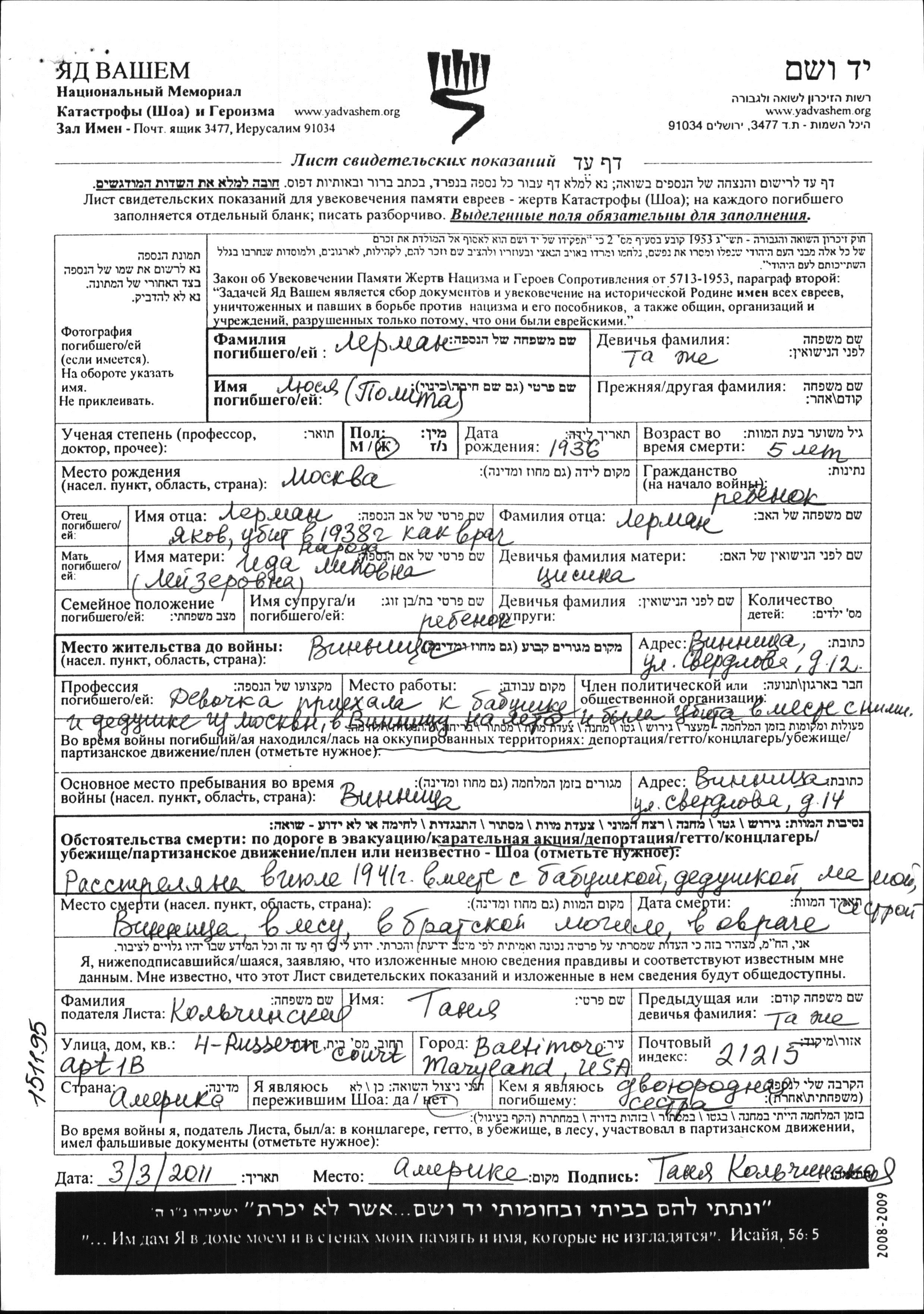 Lerman Lyusya Polita 1936 Vinnitsa, Ukraine (URSS) Feuille de témoignage