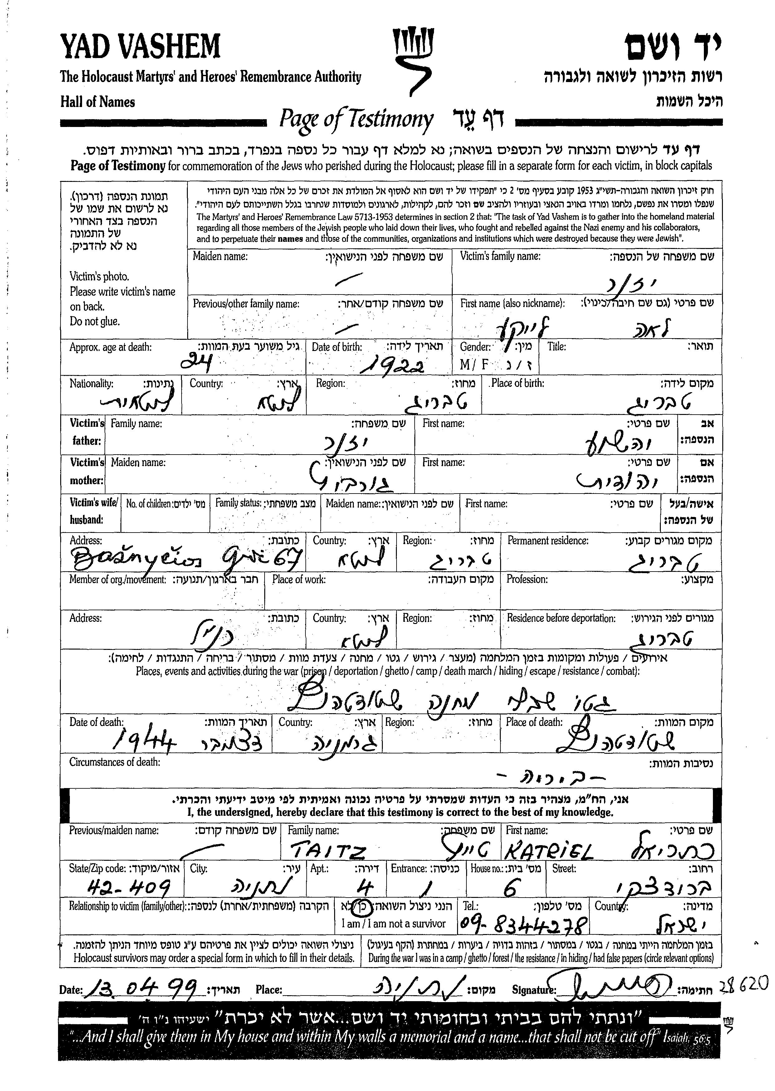 Yad Vashem - Pages of Testimony Names Memorial Collection