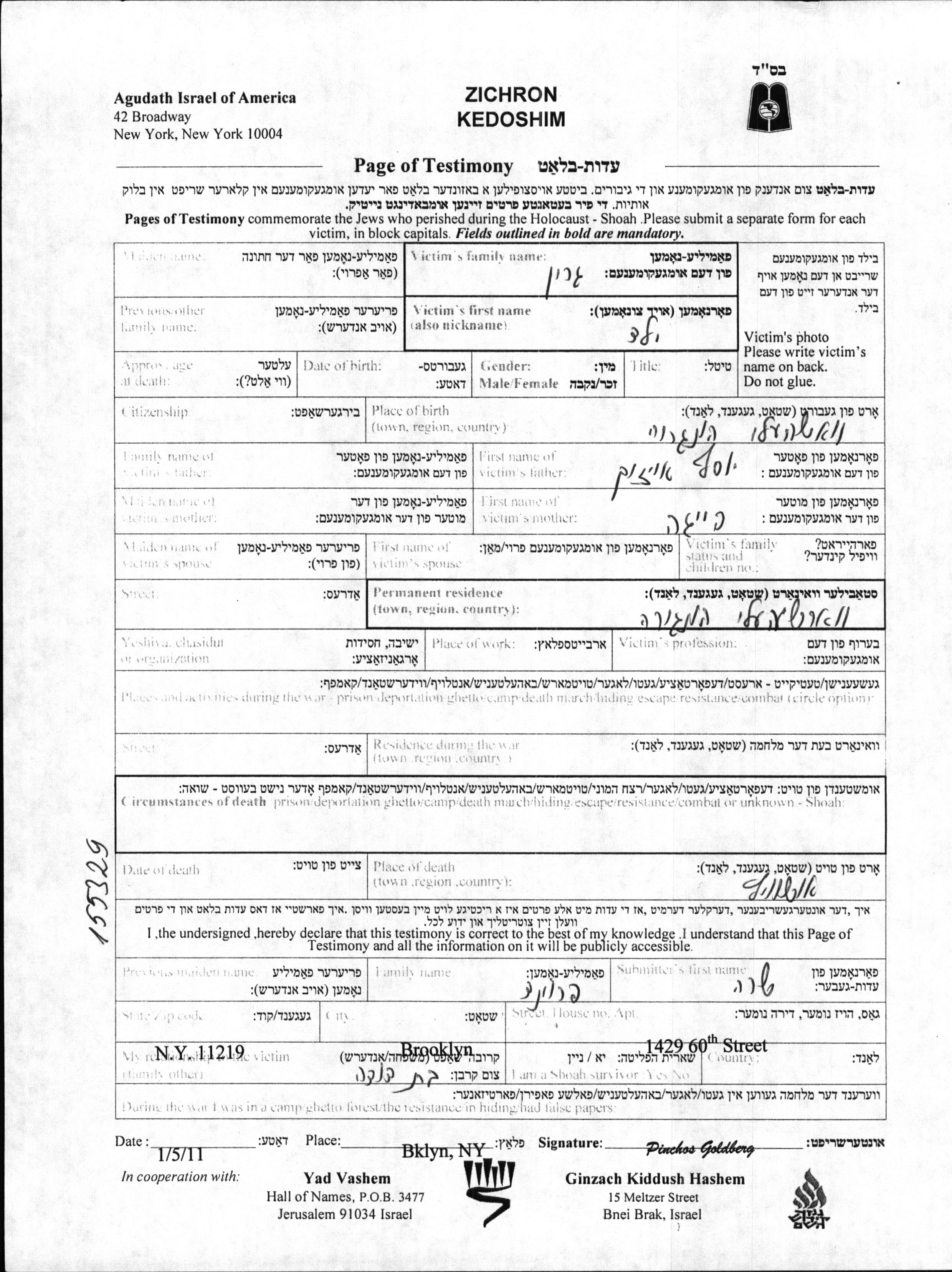 Yad Vashem - Pages of Testimony Names Memorial Collection
