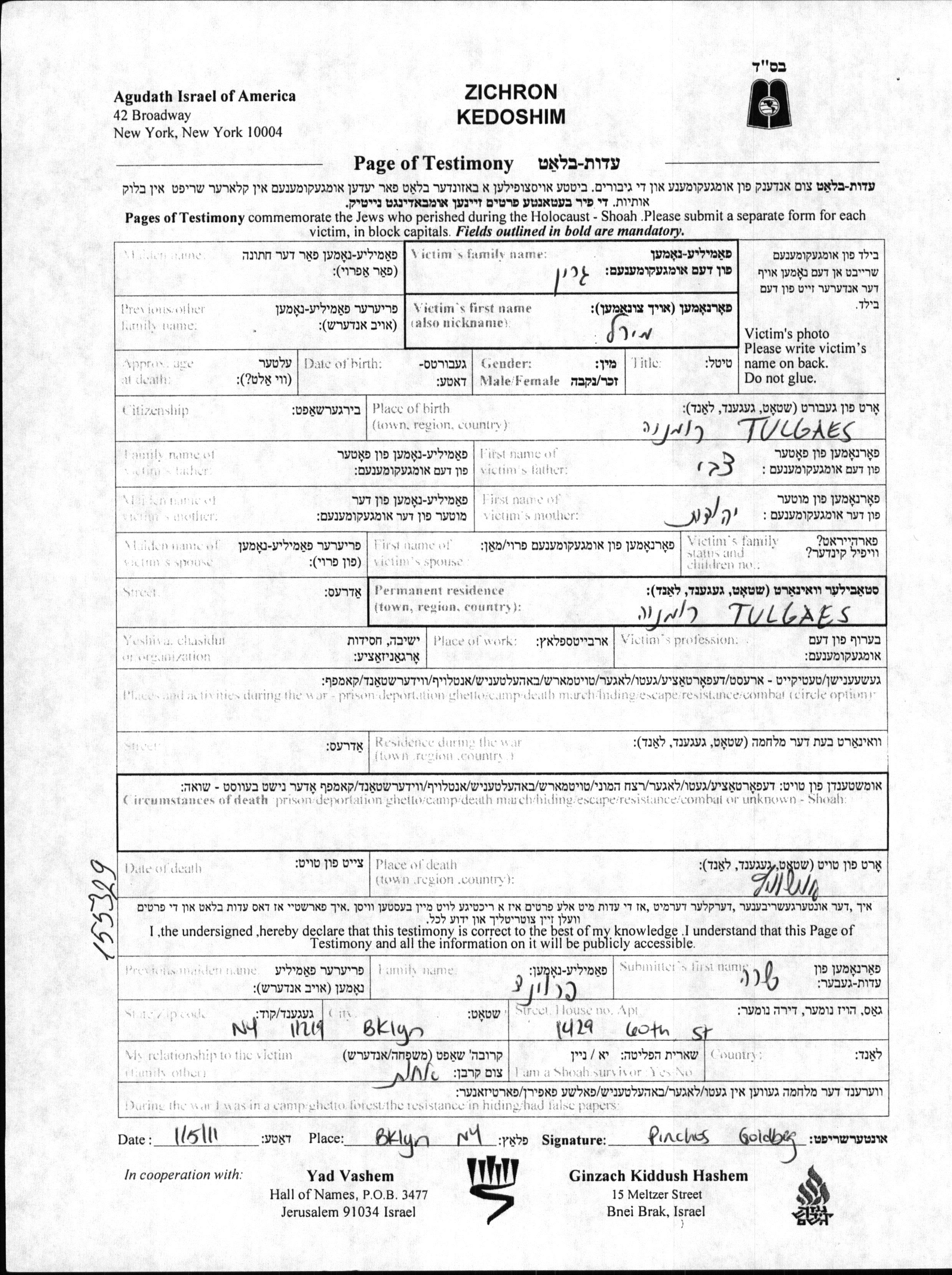 Yad Vashem - Pages of Testimony Names Memorial Collection