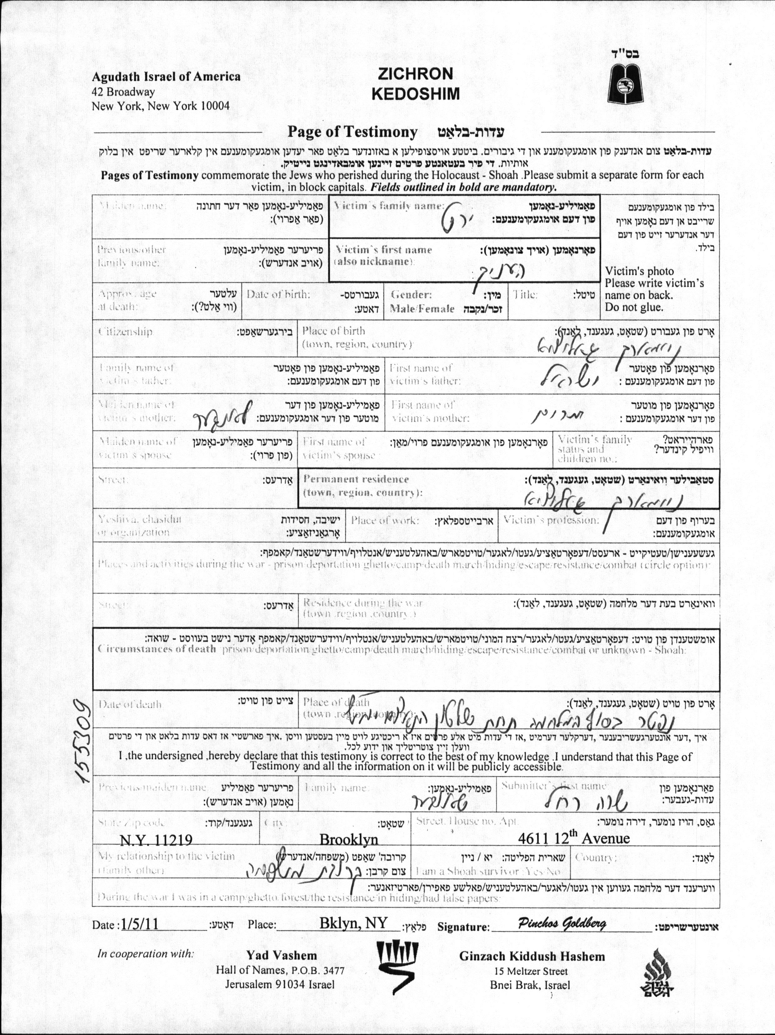Yad Vashem - Pages of Testimony Names Memorial Collection