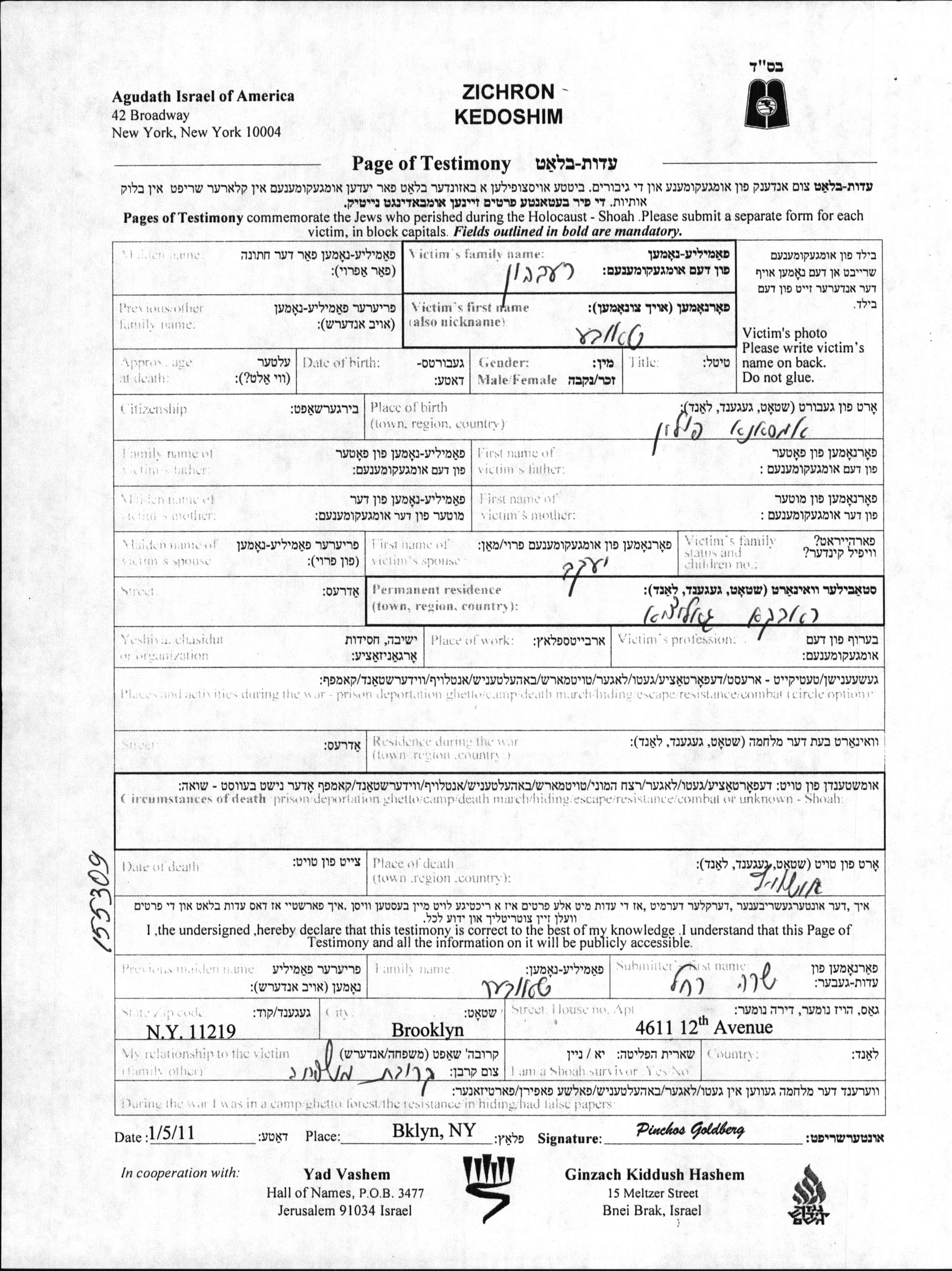Yad Vashem - Pages of Testimony Names Memorial Collection