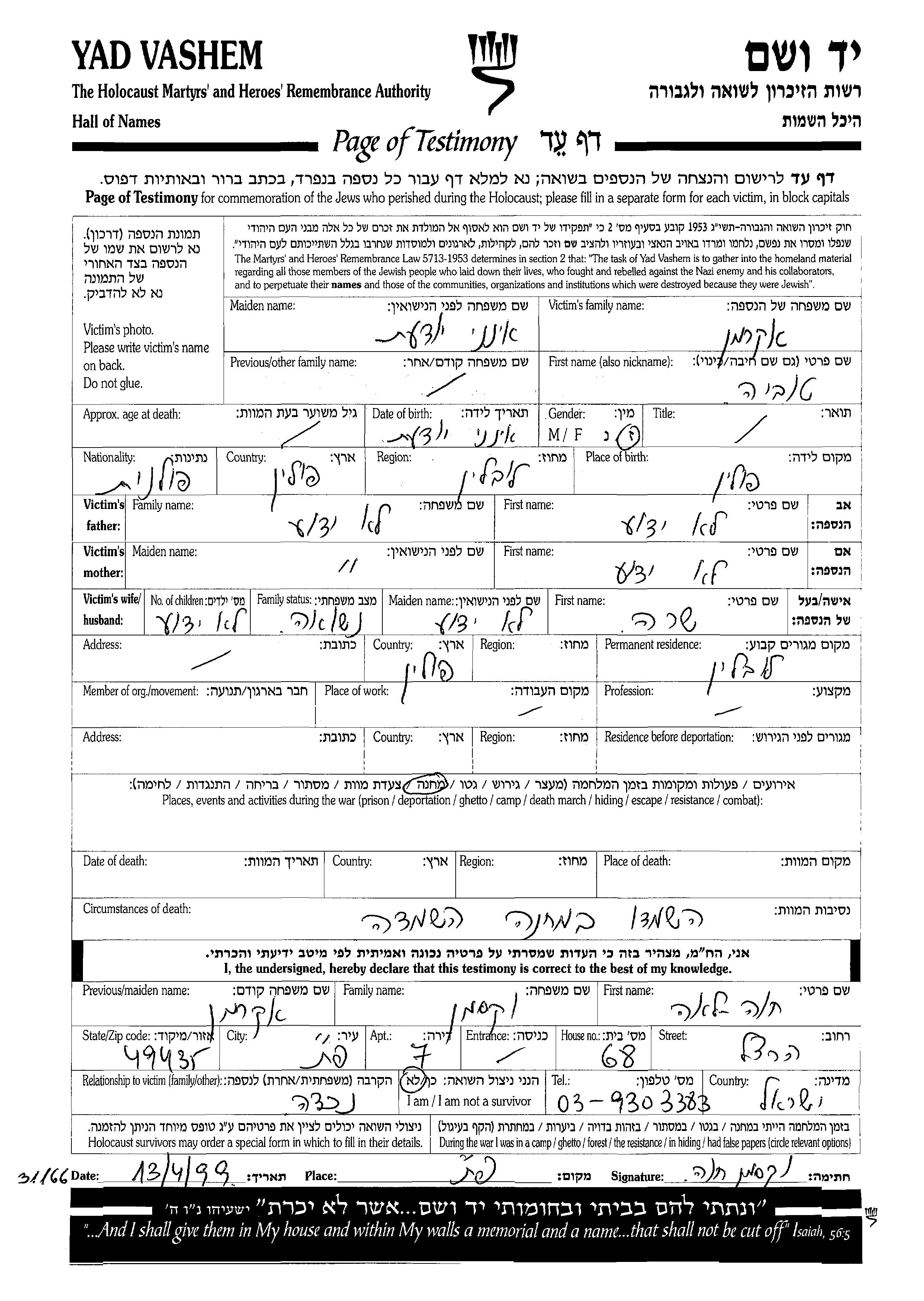 Akerman Tuvia Lublin, Pologne Feuille de témoignage