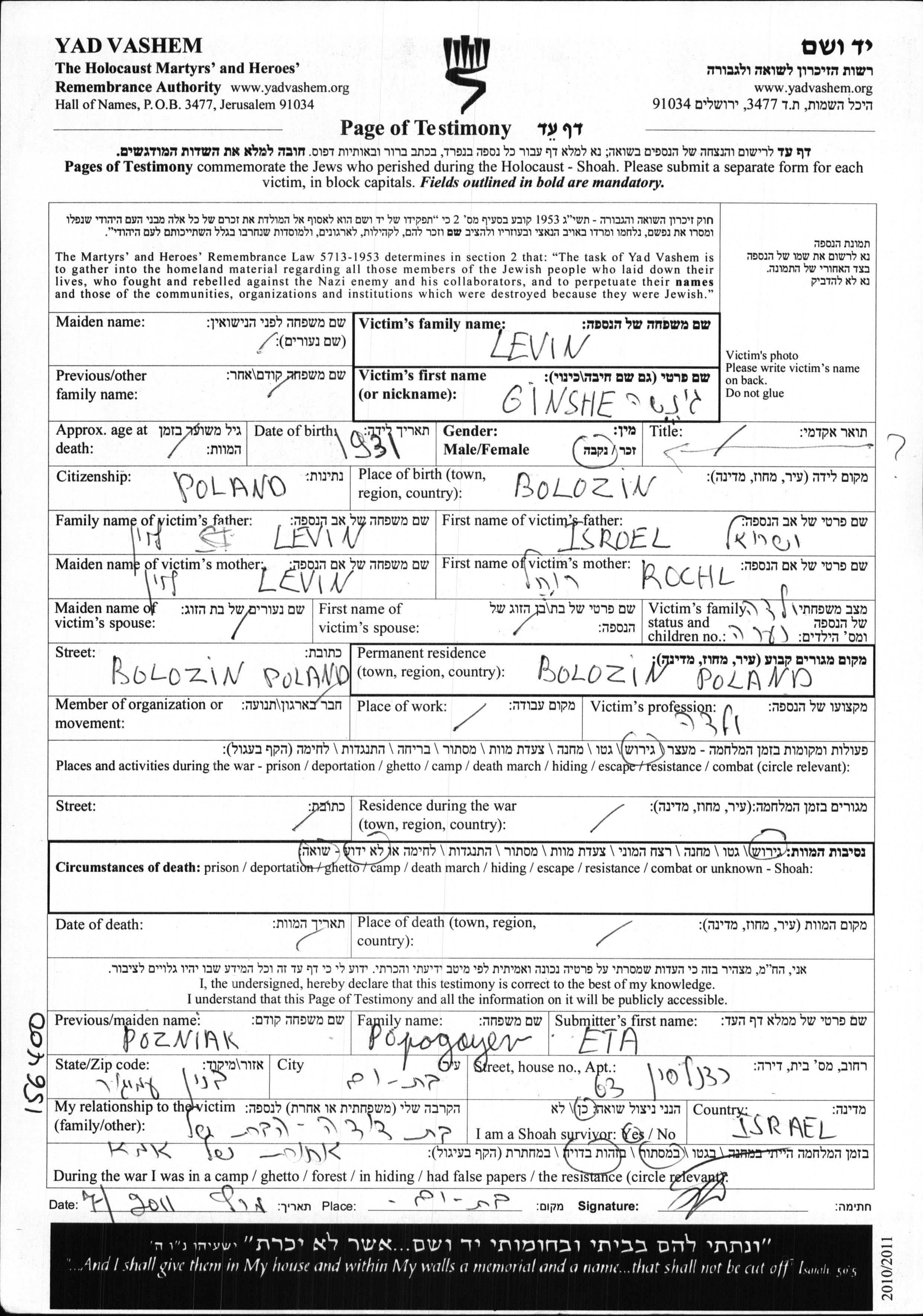 Levin Ginshe Ginesha 1931 Wolozyn, Pologne Feuille de témoignage