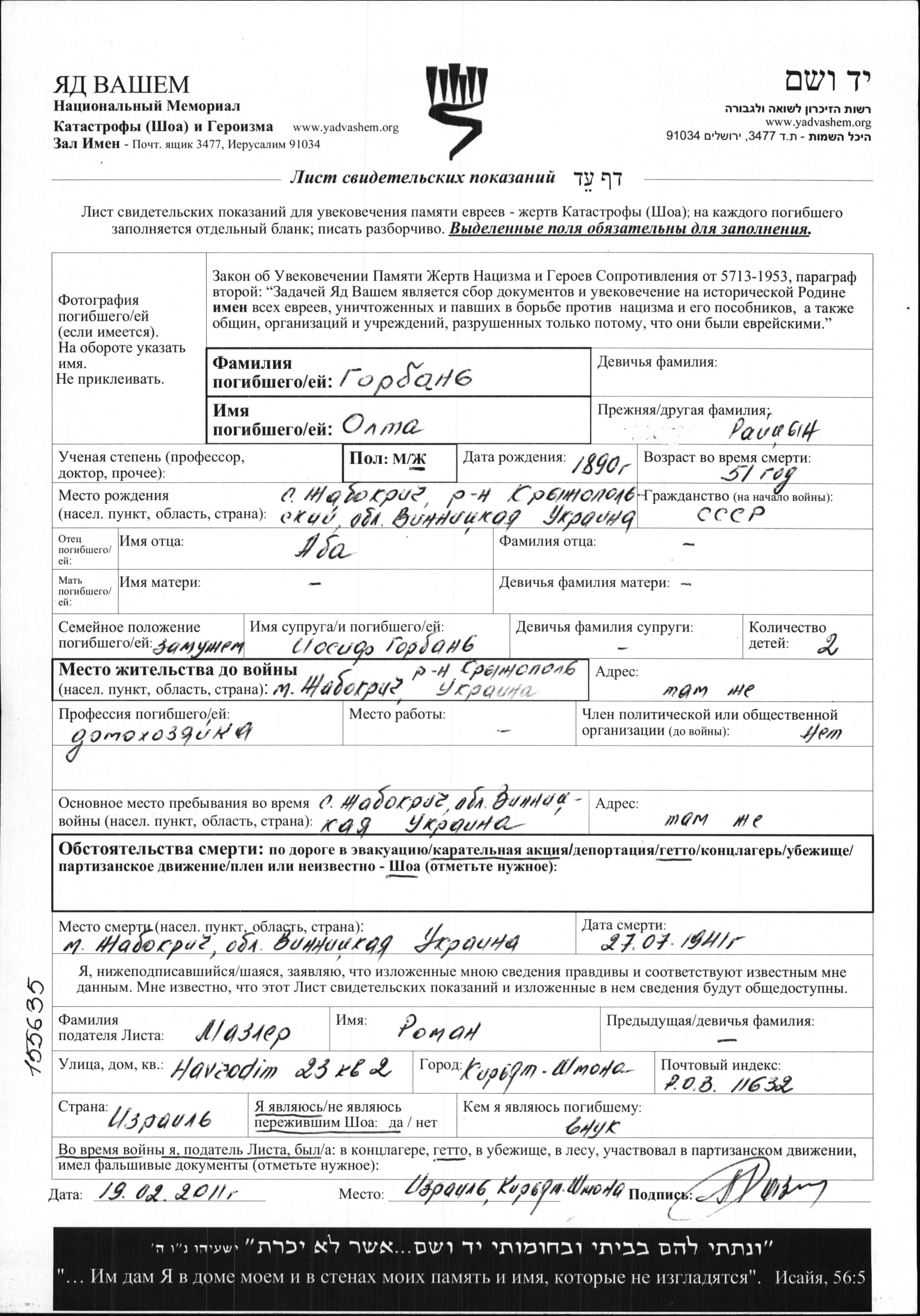 Gorban Olta 1890 Zhabokrich, Ukraine (URSS) Feuille de témoignage