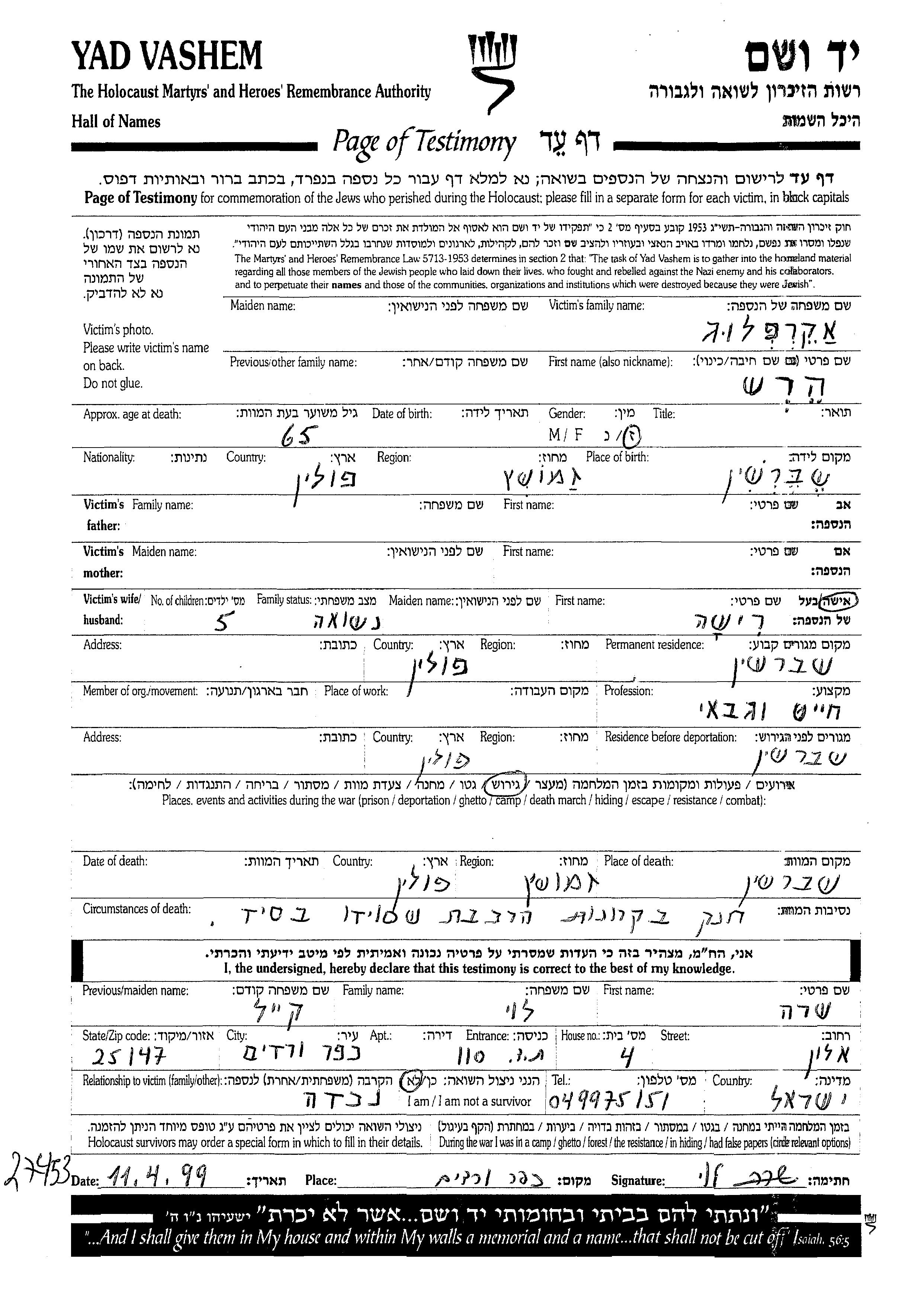 Akerflug Hersh Sebersin, Pologne Feuille de témoignage