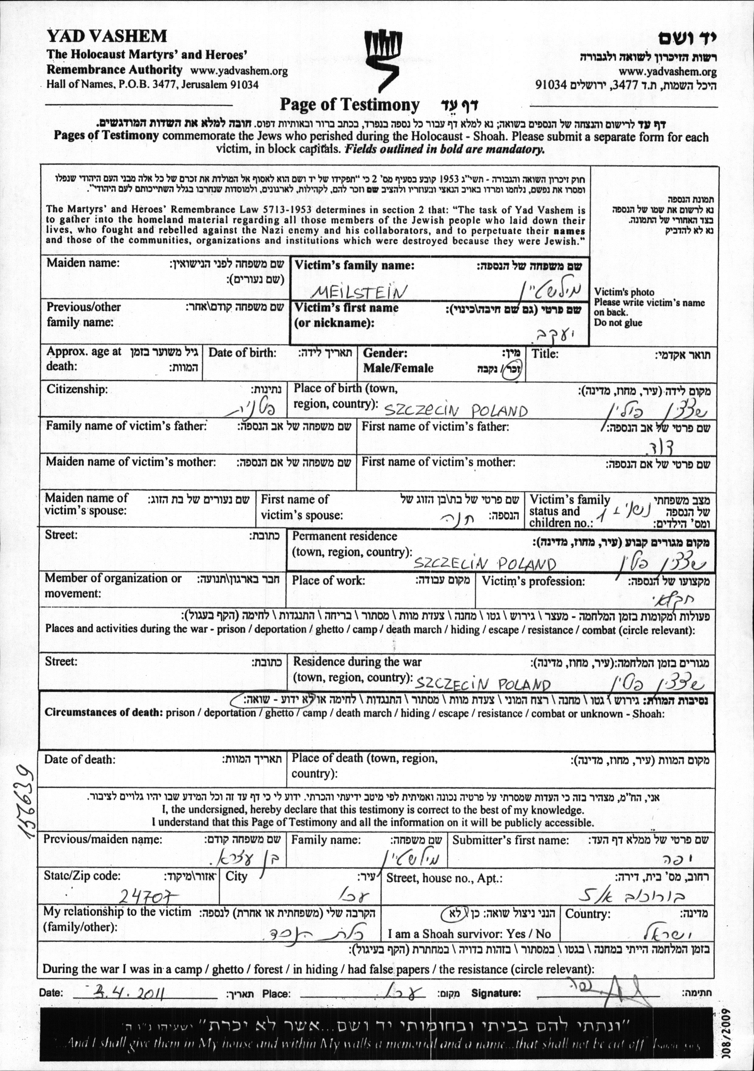 Mielstein Yaakov Szczecin, Allemagne Feuille de témoignage