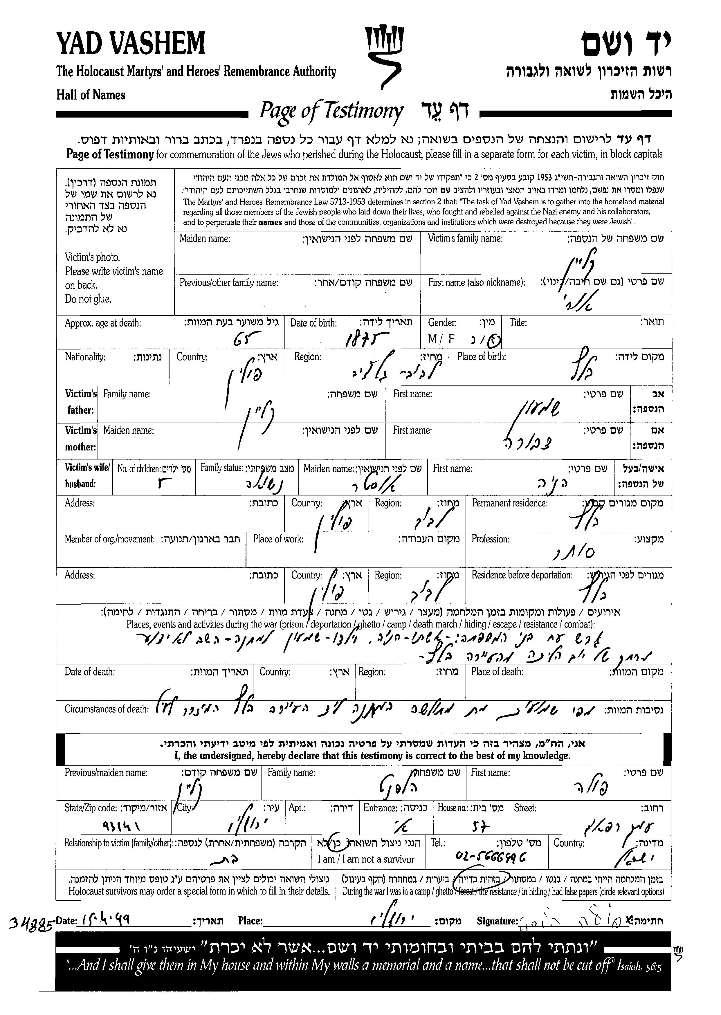 Yad Vashem - Pages of Testimony Names Memorial Collection