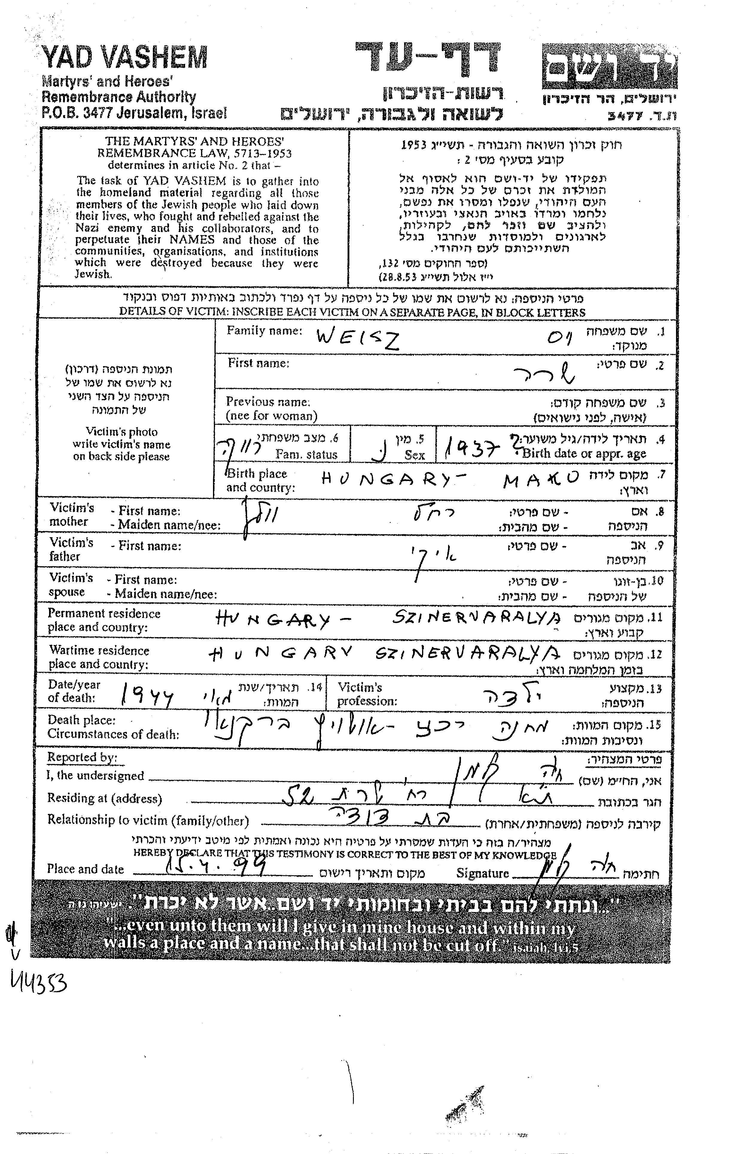 Weisz Sara 1937 Szinervaralya, Roumanie Feuille de témoignage