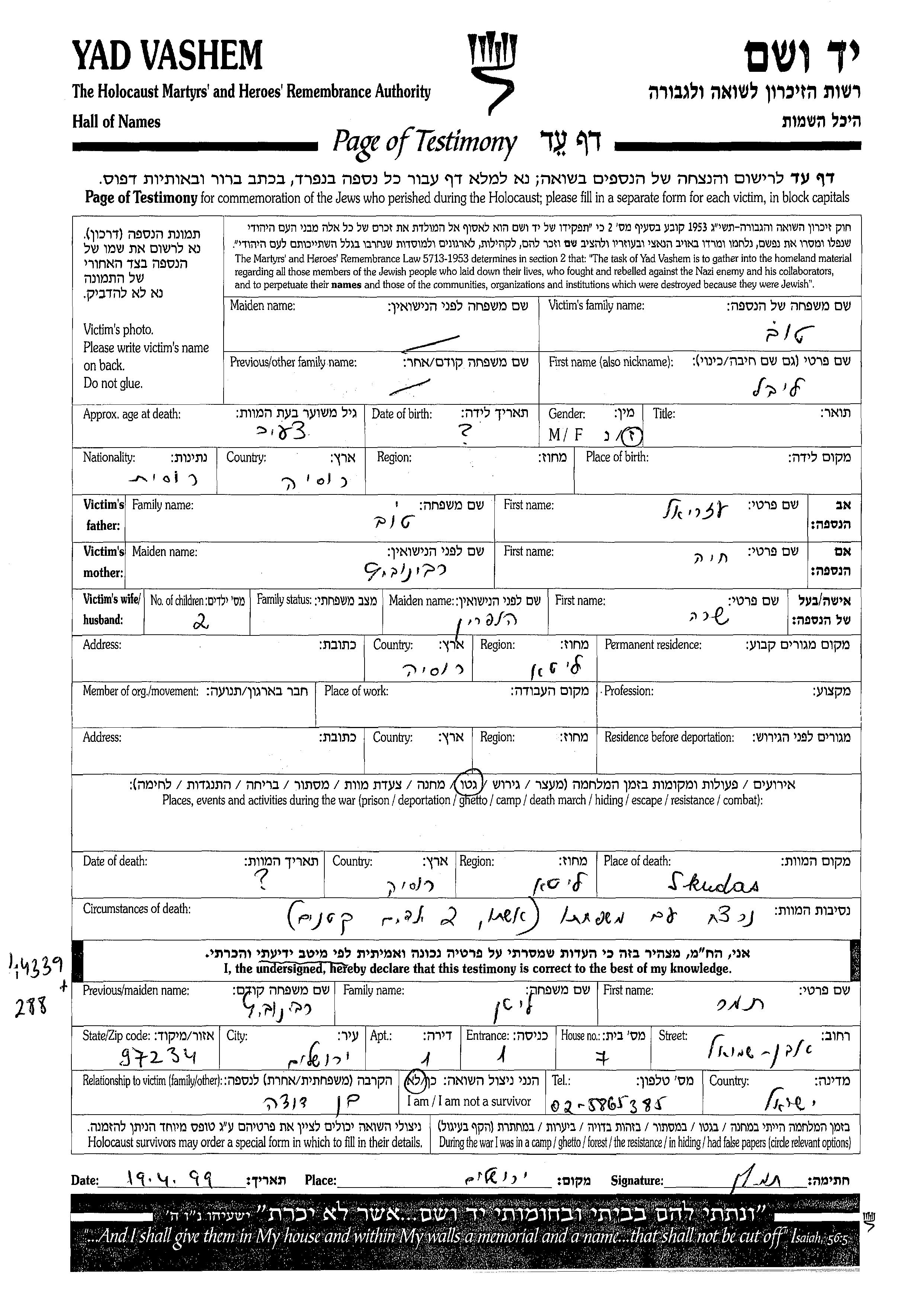 Yad Vashem - Pages of Testimony Names Memorial Collection