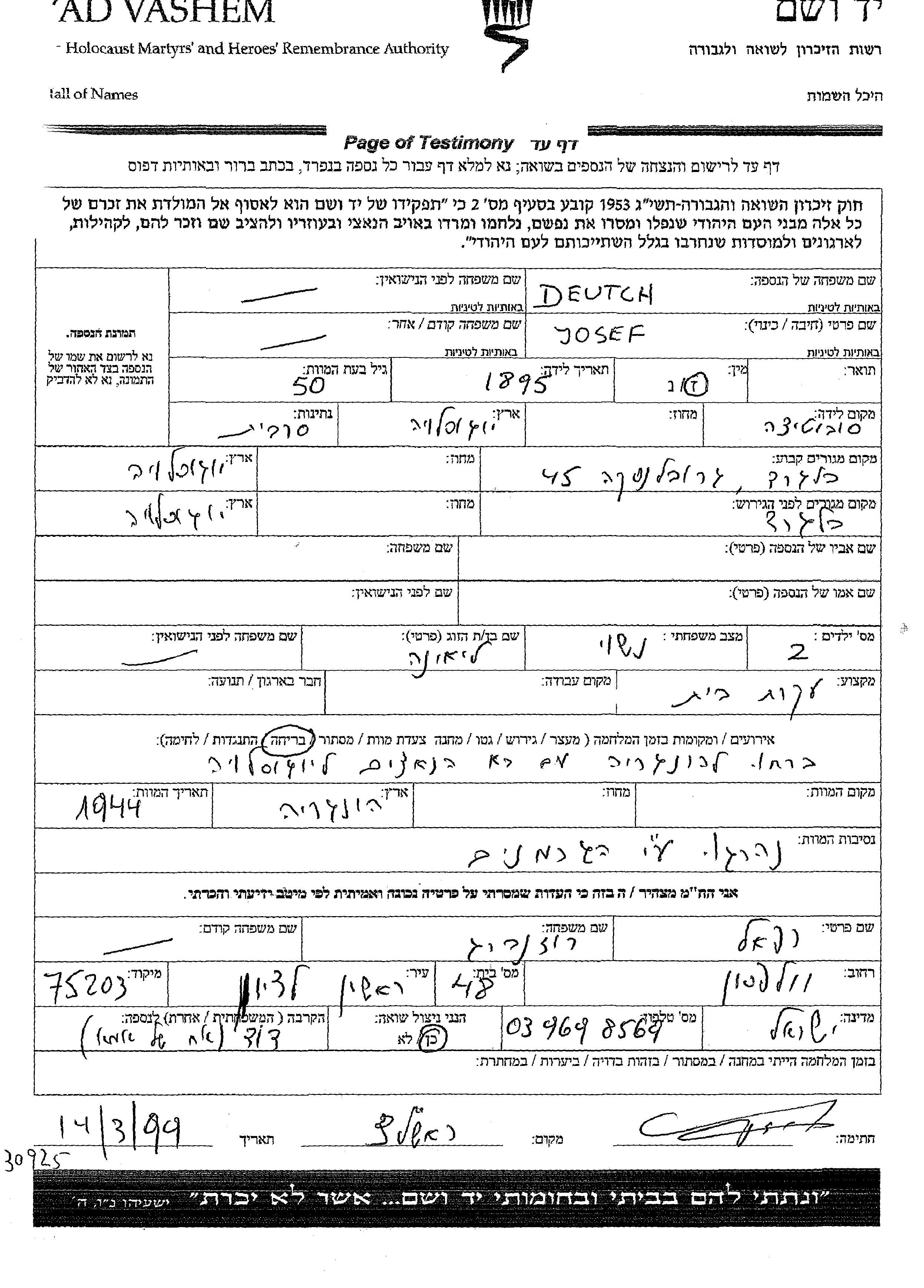 Deutch Josef 1895 Belgrad, Yugoslavie Feuille de témoignage