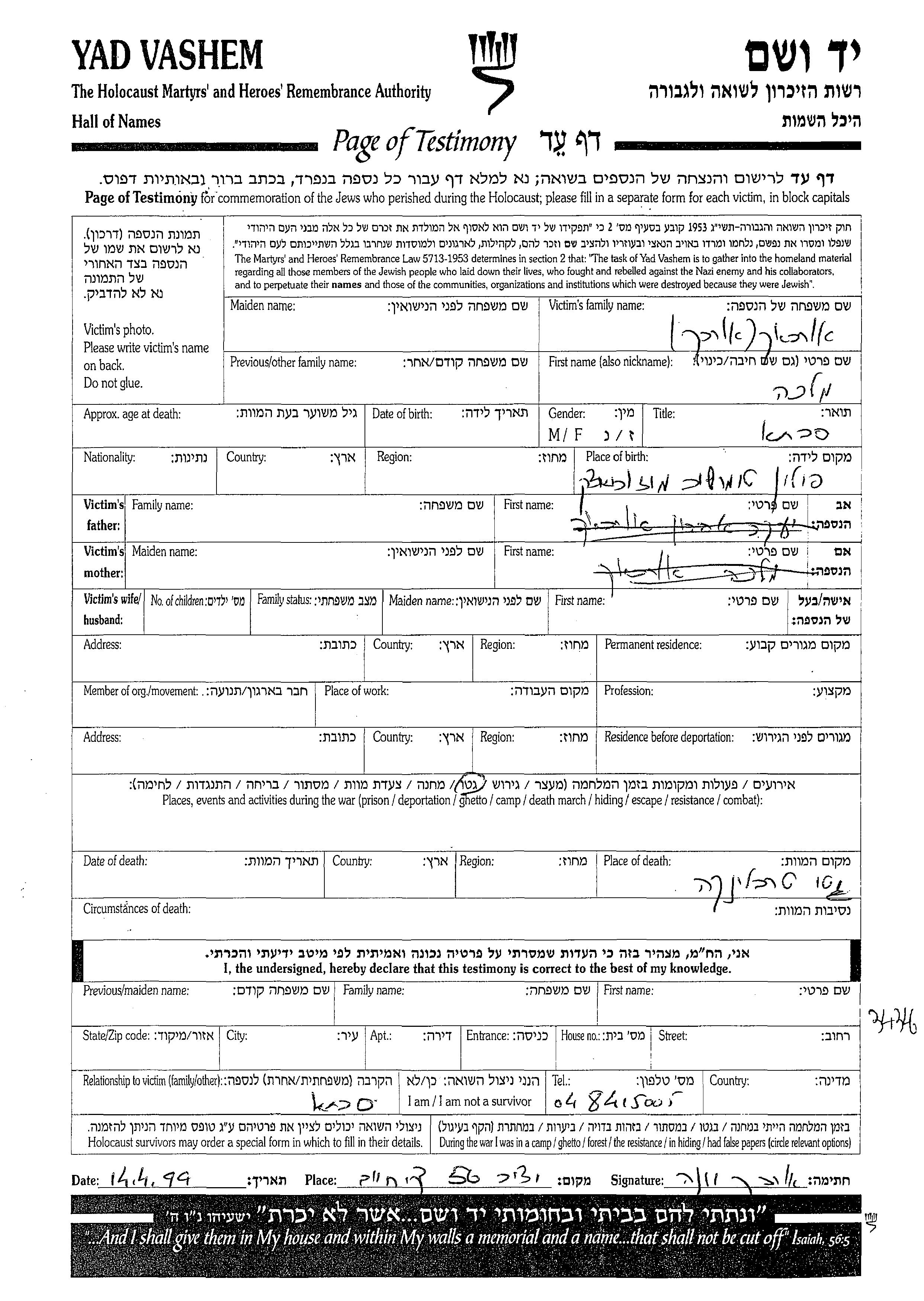 Yad Vashem - Pages of Testimony Names Memorial Collection
