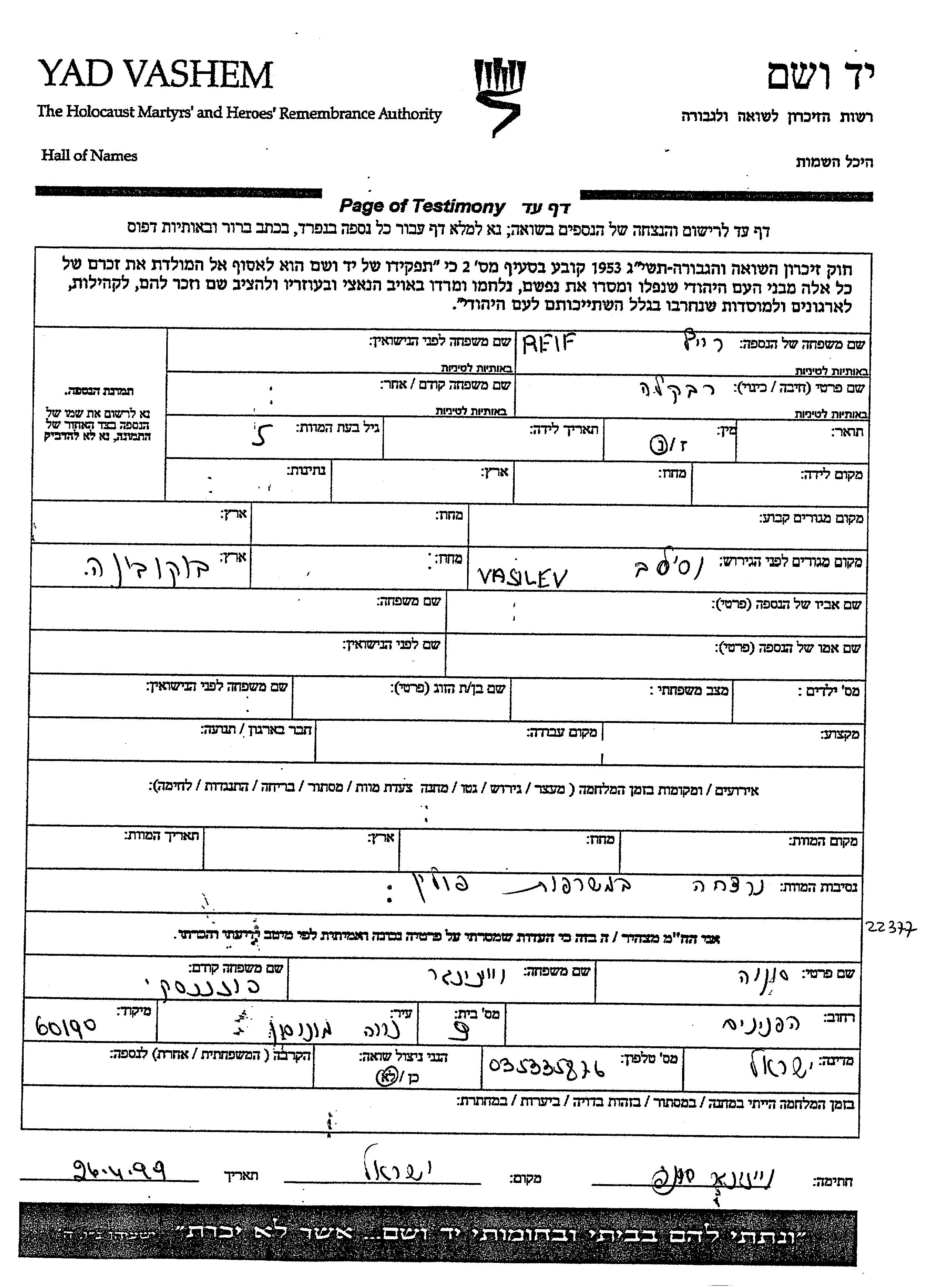Reif Rivka endroit inconnu, Feuille de témoignage