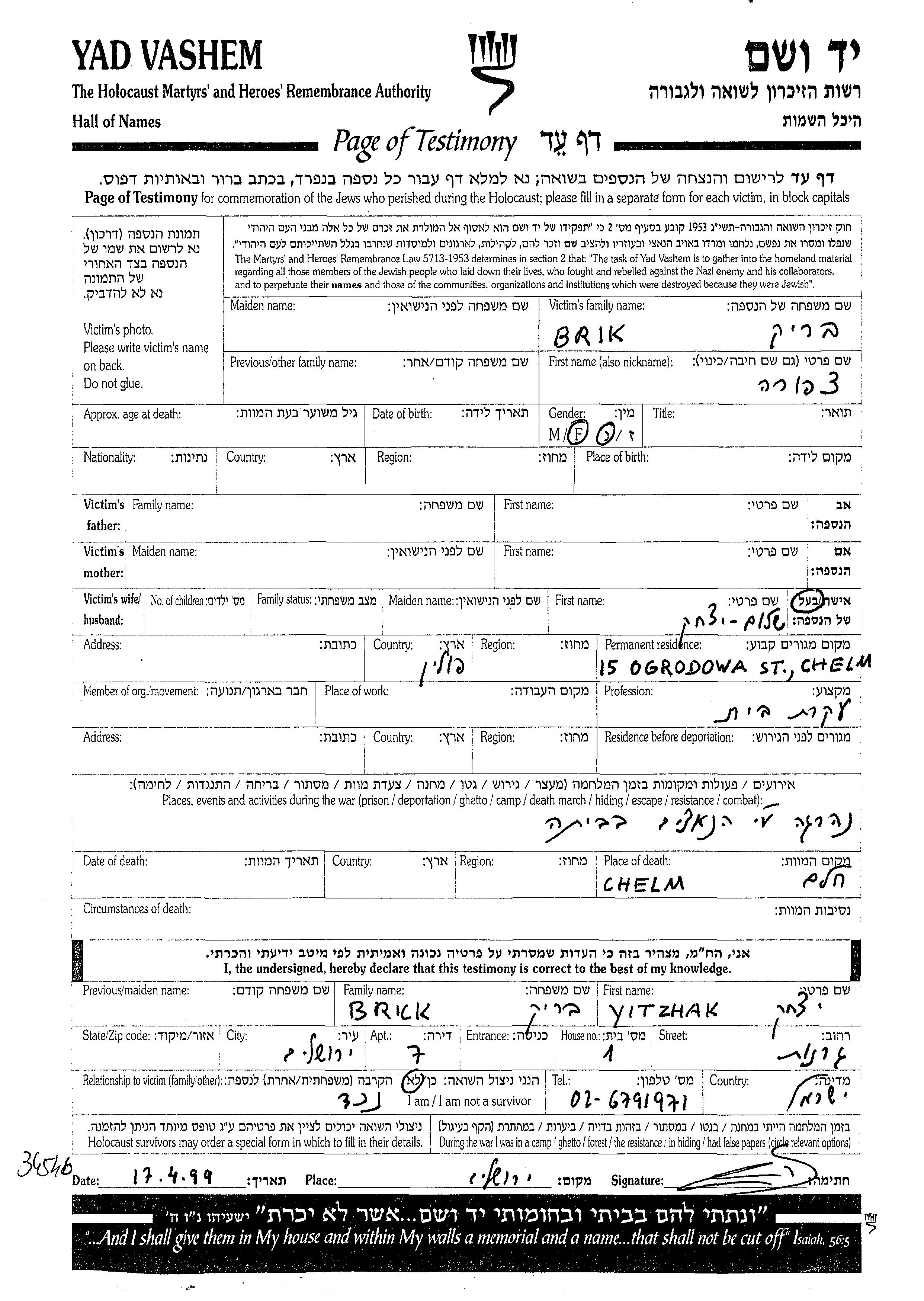 Brik Tzipora Chelm, Pologne Feuille de témoignage