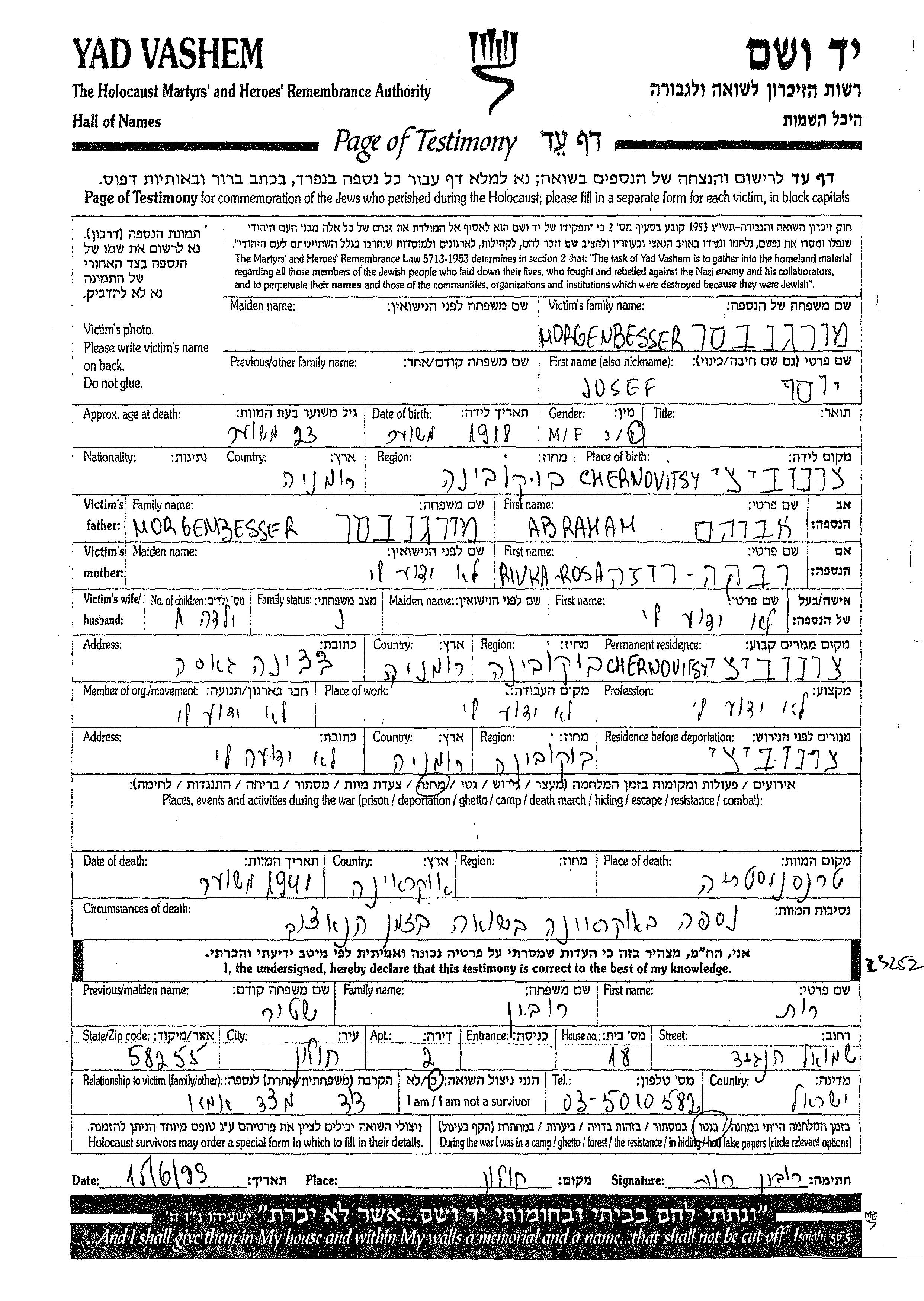 Morgenbesser Josef 1918 Czernowitz, Roumanie Feuille de témoignage