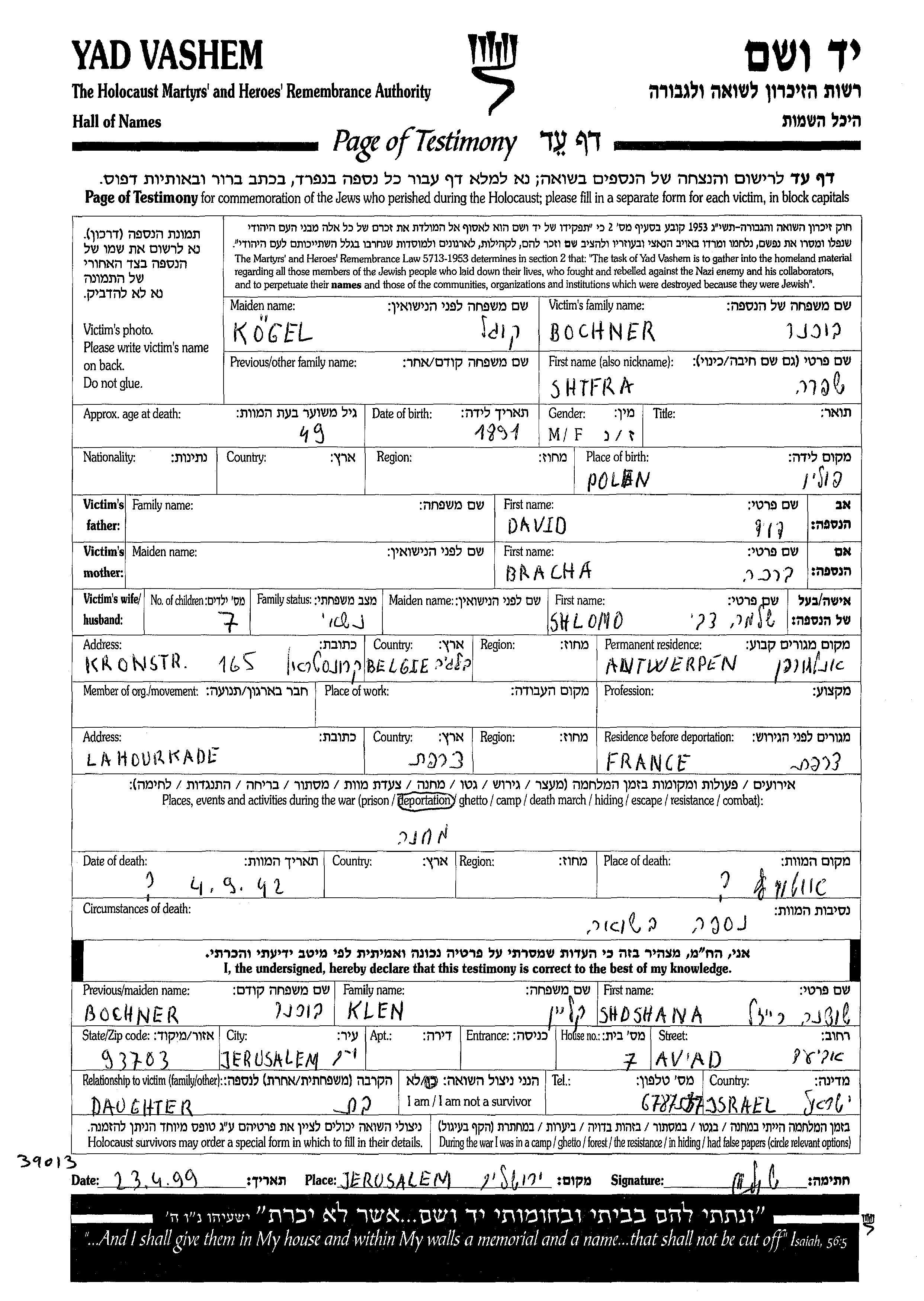 Bochner Shifra 1891 Antwerpen, Belgique Feuille de témoignage