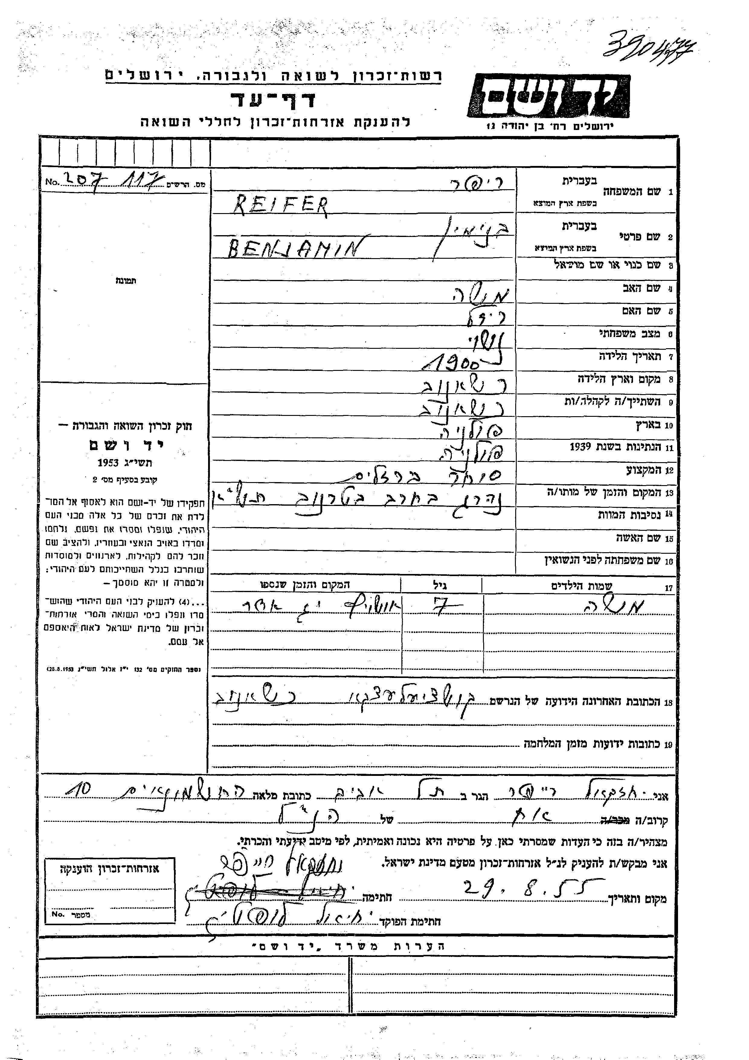 Reifer | Benjamin | 1904 | Chrzanow, Pologne | Feuille de témoignage |
